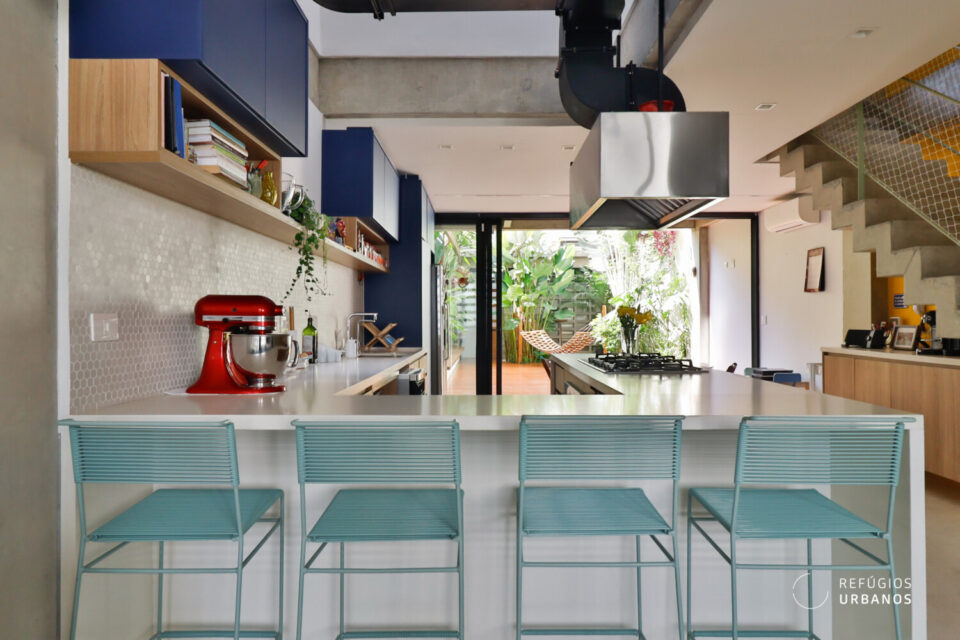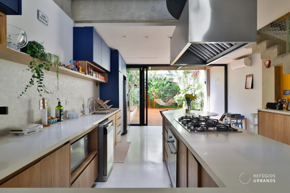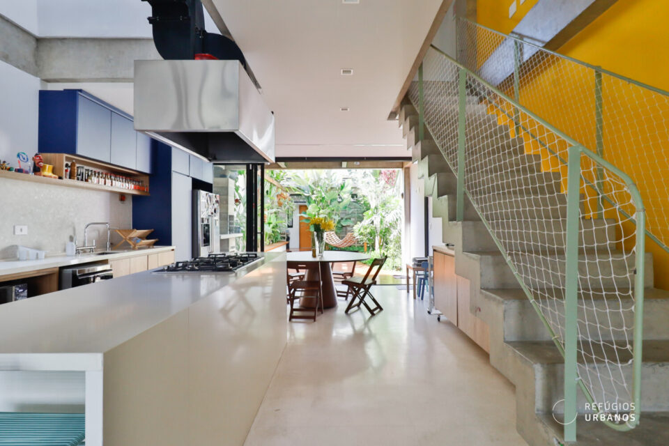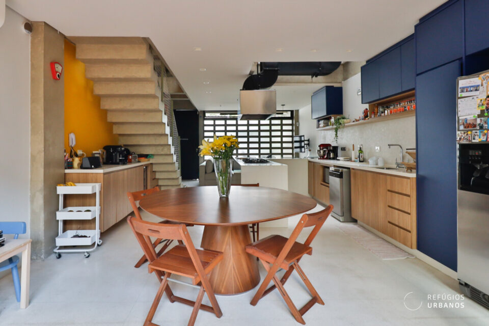 Ao entrar, a casa já revela sua essência. Assim que a porta se abre, sala, cozinha e quintal aparecem totalmente conectados, criando um térreo amplo e envolvente. Não por acaso, a reforma se concentrou em ampliar vãos, favorecer a iluminação natural e estimular a ventilação cruzada. Como resultado, temos um ambiente fluido, confortável e convidativo.