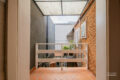Voltando ao primeiro pavimento, chegamos à área externa, que é separada da cozinha por portas de madeira e vidro. Para além da divisão dos ambientes, esses detalhes deixam a casa ainda mais charmosa.