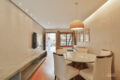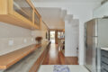 Um espaçoso living de dois ambientes integra a casa por meio de um hack multiuso em concreto, percorrendo os cômodos até chegar à cozinha. O piso é um charme à parte: com revestimento em madeira natural, traz, desse modo a sensação de um ambiente acolhedor e familiar.