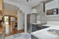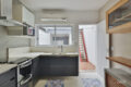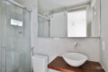Uma escada minimalista em granilite nos leva ao andar superior íntimo, contendo dois quartos confortáveis e um banheiro super estiloso.