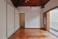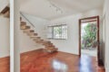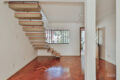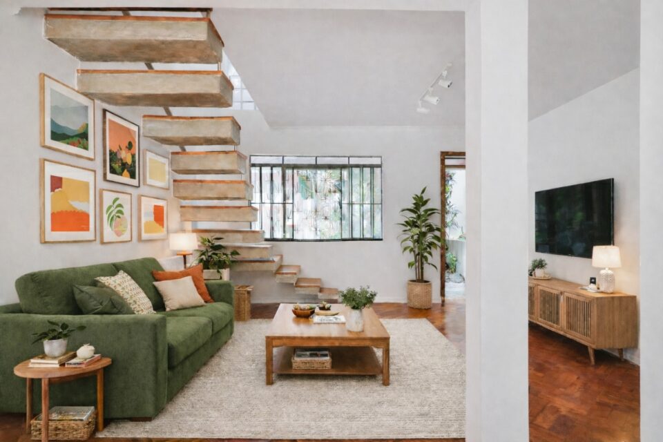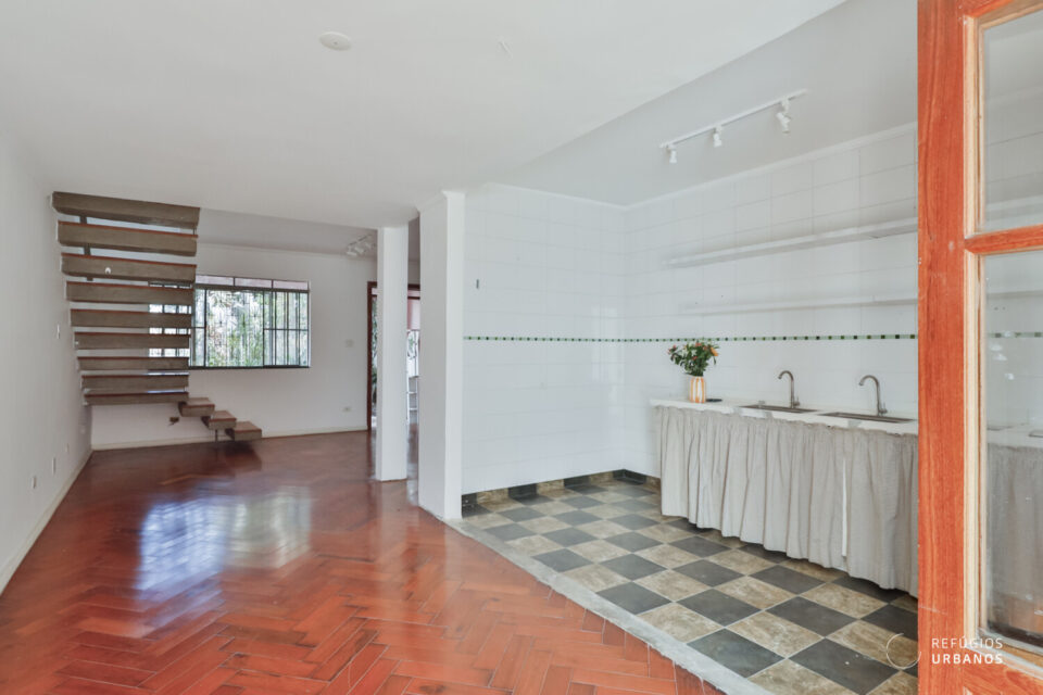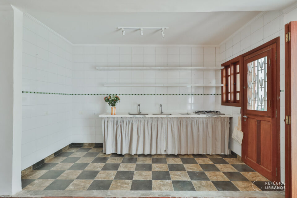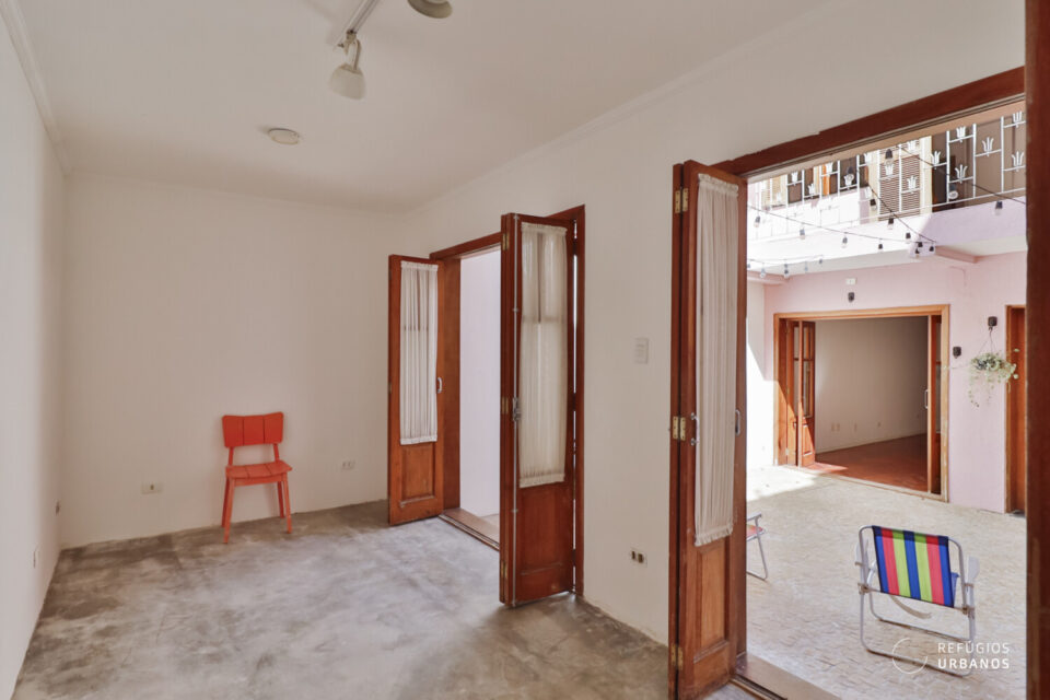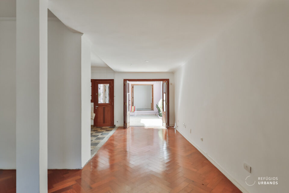 Assim que entramos, as portas balcão de madeira e vidro conduzem naturalmente nosso olhar até o quintal. Antes disso, porém, a sala em formato de “L” se abre com generosidade. Ela acomoda tranquilamente dois ou três ambientes, oferece ótima iluminação e ventilação, e ainda preserva o piso original de tábuas largas. Na sequência, a cozinha integrada amplia a sensação de fluidez e pode ganhar ainda mais personalidade com uma boa marcenaria, uma ilha central ou uma bancada de apoio adicional.