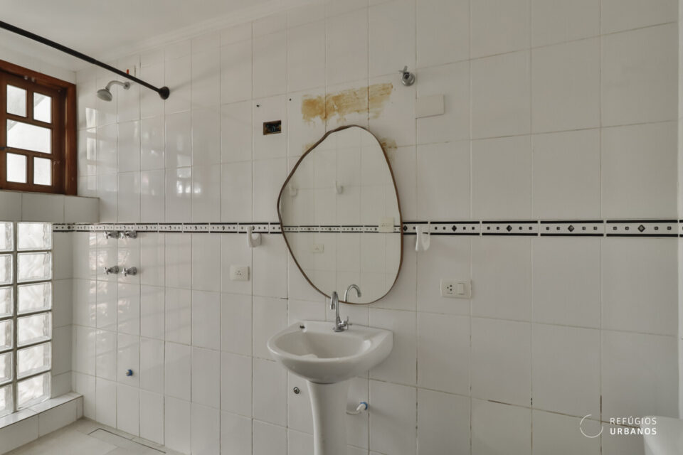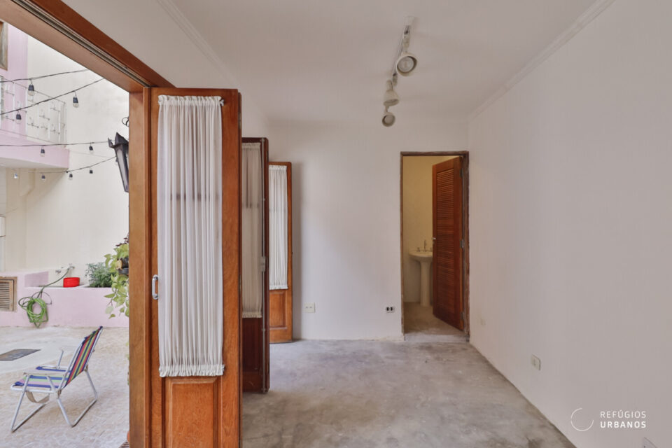 Seguindo para o fundo do terreno, encontramos primeiro um pequeno depósito do lado esquerdo e, logo depois, a edícula. Ela surpreende pelo tamanho e pela ótima ventilação e iluminação. As duas portas balcão de madeira, lindas e imponentes, transformam o espaço no cenário perfeito para um escritório ou ateliê. Além disso, a edícula inclui um lavabo novinho, que traz ainda mais praticidade.