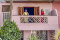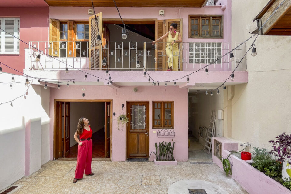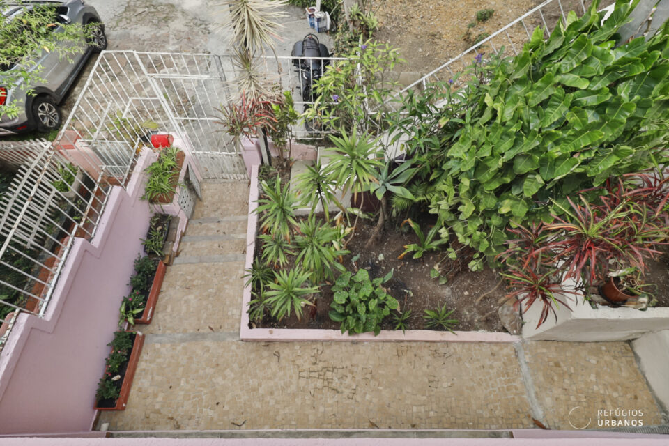 O portão, de ferro antigo e baixinho, já dá o tom da casa. Logo na frente, um pequeno jardim acolhe os moradores, assim como acontece nas outras casas da vila. A fachada mantém todo o charme original: os cobogós no parapeito da varanda, as esquadrias antigas de serralheria e o gradio gracioso se destacam de imediato. A porta continua original, mas agora conta com uma fechadura eletrônica, o que garante mais praticidade.