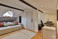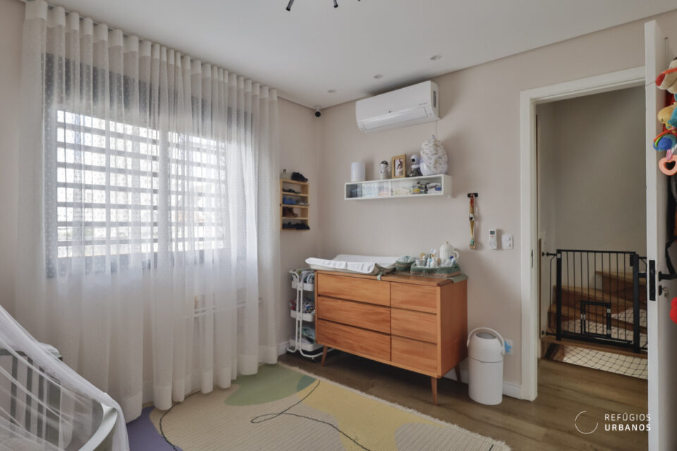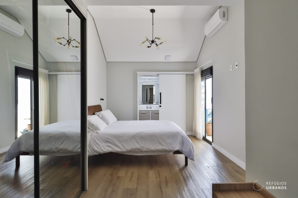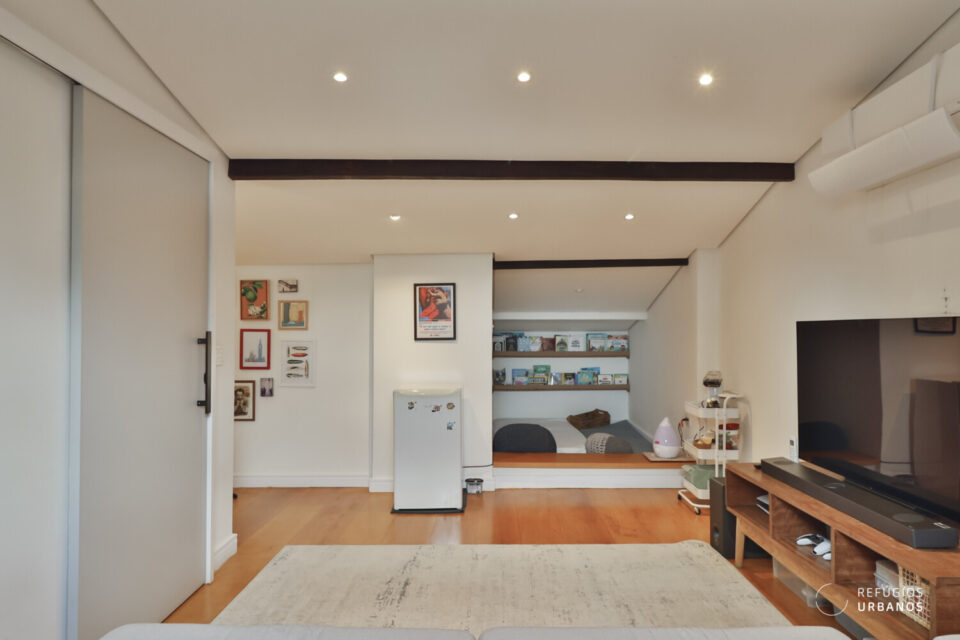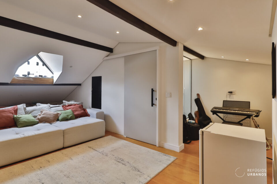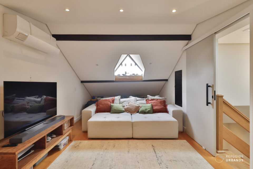 Mas a surpresa mora em um pavimento acima, que lembra os tradicionais sótãos em casas americanas. O espaço foi configurado como uma sala de tv/leitura, um outro canto de paz da casa.