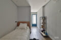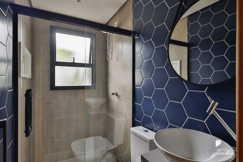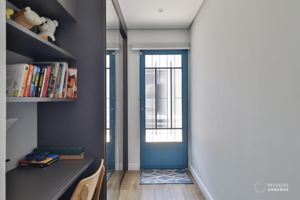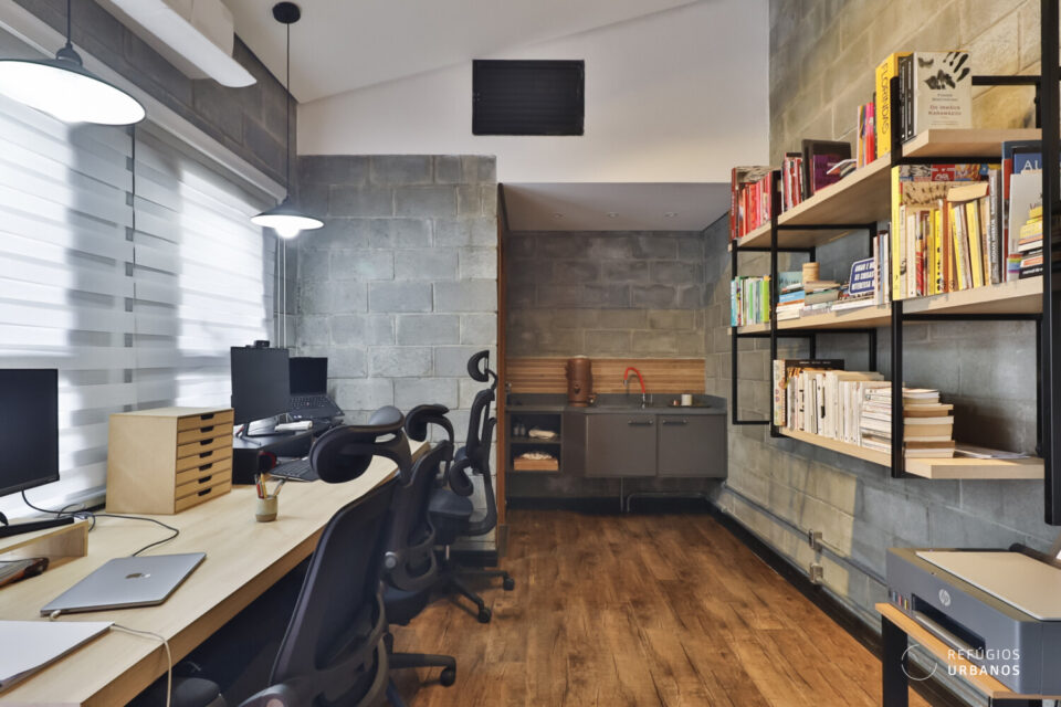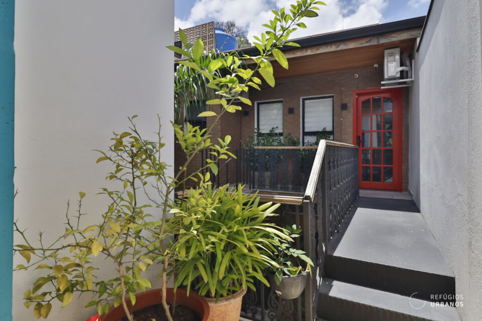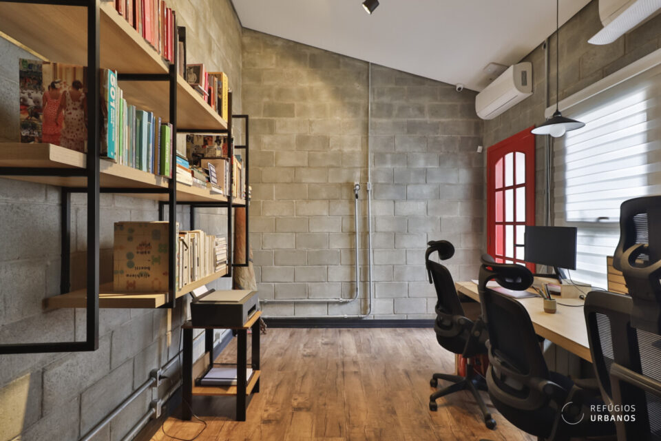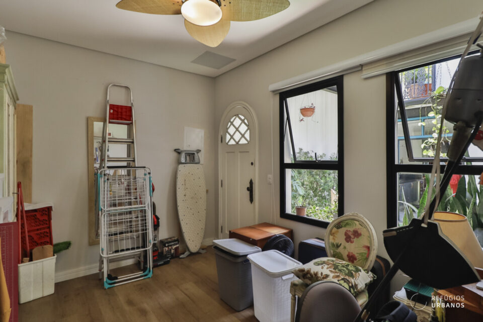 Em seguida encontramos a edícula. Na configuração atual, temos um atelier embaixo e um escritório em cima. Os dois cômodos possuem um banheiro completo em cada, o que torna os ambientes curingas e possíveis de serem utilizados com funções diferentes. Como por exemplo, quarto de hóspedes ou até mesmo um dormitório para um filho adolescente que quer um pouco mais de independência.