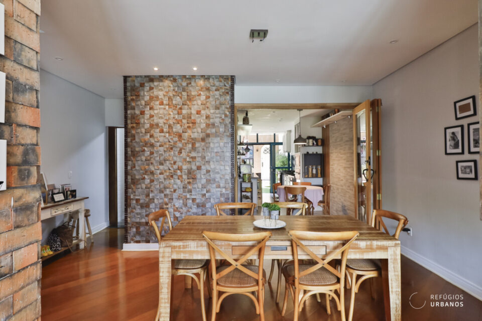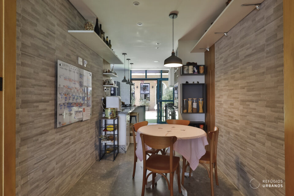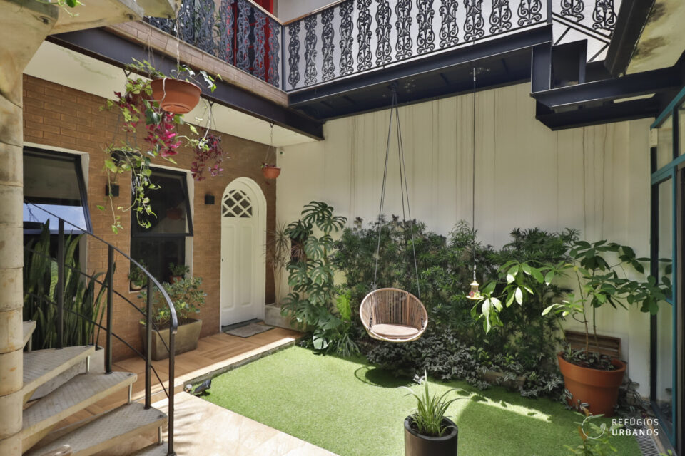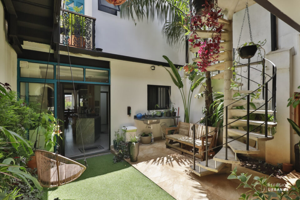 Enfim, chegando nos fundos da casa, há um confortável quintal, perfeito para quem gosta de receber. A porta de acesso da cozinha ao espaço nos convida, tornando os ambientes quase que integrados.