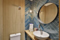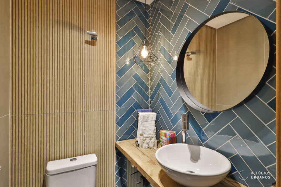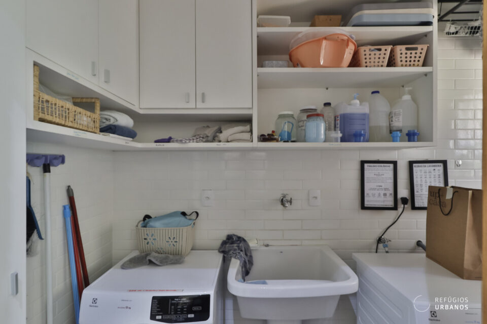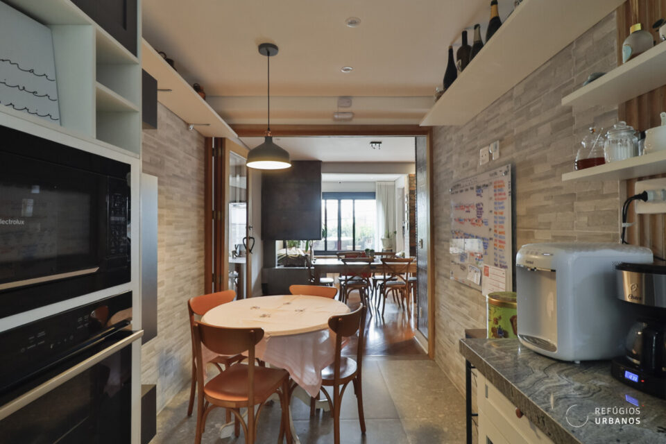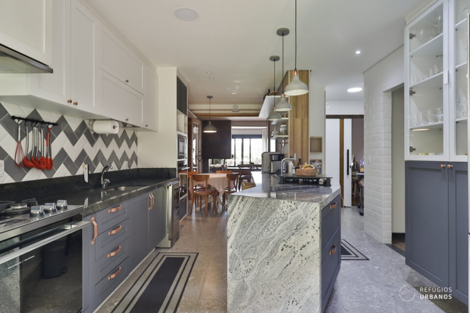 Ainda falando sobre a sala, ela foi integrada com a cozinha, que por sua vez se comunica com o quintal. Essa integração foi fundamental para tornar os ambientes bem iluminados e arejados, pois temos ventilação cruzada. A cozinha é ampla, com bastante marcenaria, uma ilha com fogão e cooktop, além de uma espaçosa lavanderia. Temos ainda um lavabo que atende a esse primeiro pavimento social. O quintal também fica nesse primeiro pavimento, mas falaremos sobre ele mais adiante.