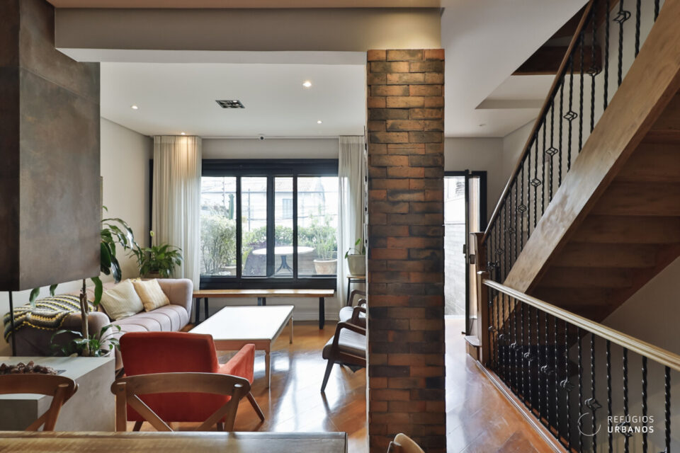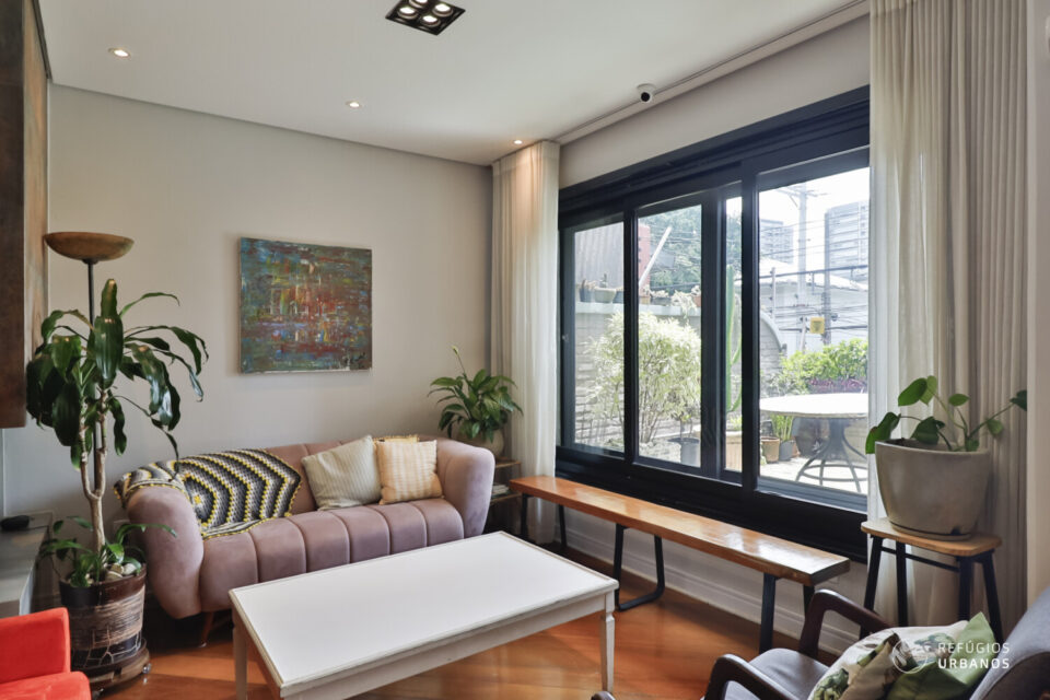 Subindo, somos recebidos por uma sala ampla, super iluminada, graças ao janelão teto piso com vista para o terraço. E sim, temos aqui a primeira área externa da casa.