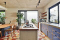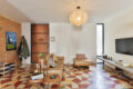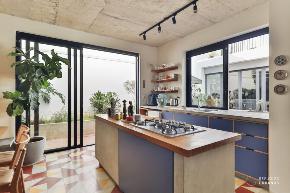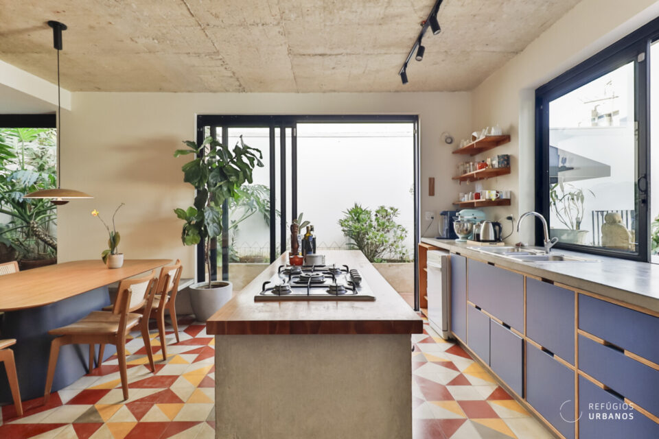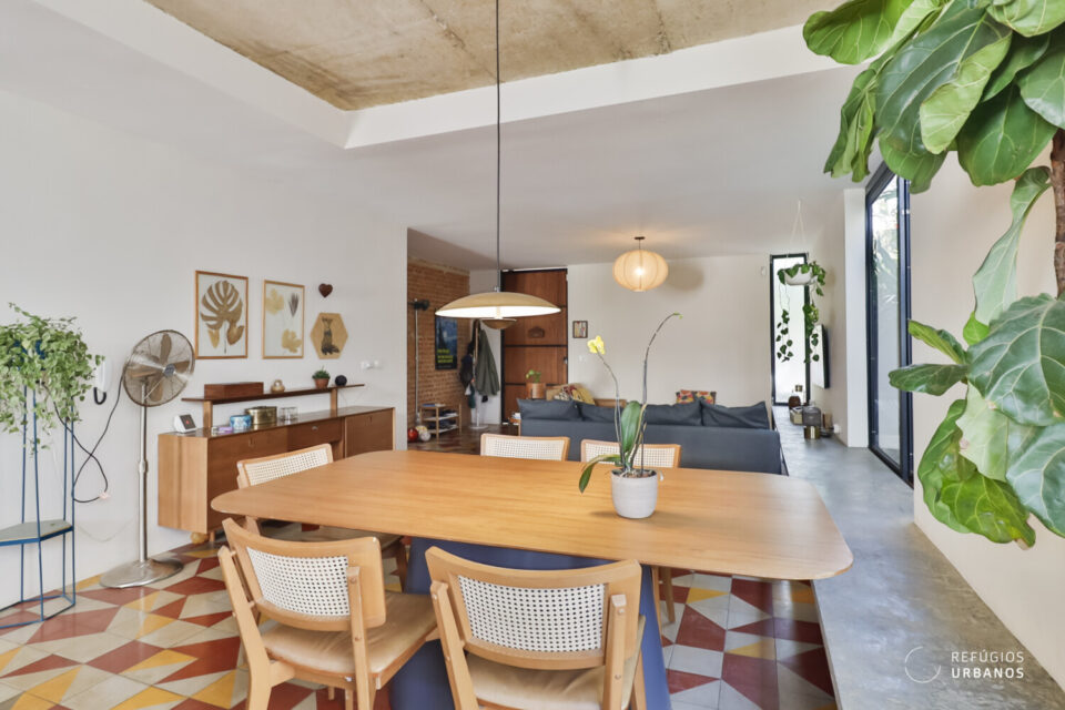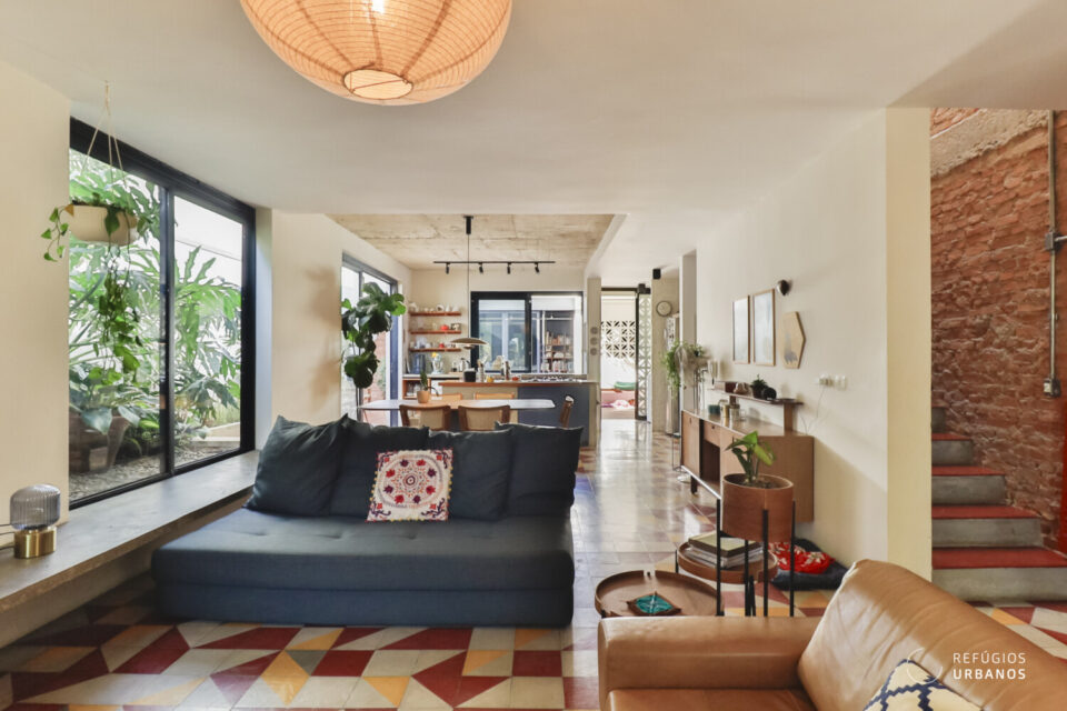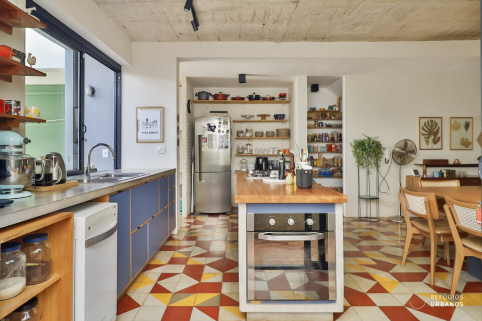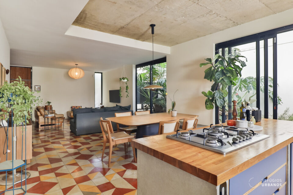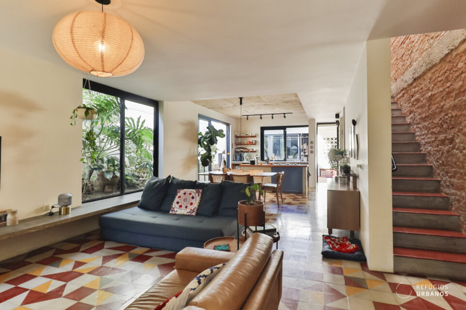 O living é integrado à cozinha, em uma atmosfera acolhedora, marcada por texturas como tijolos aparentes e piso de ladrilho hidráulico, que salta aos olhos.
