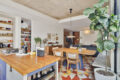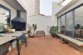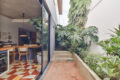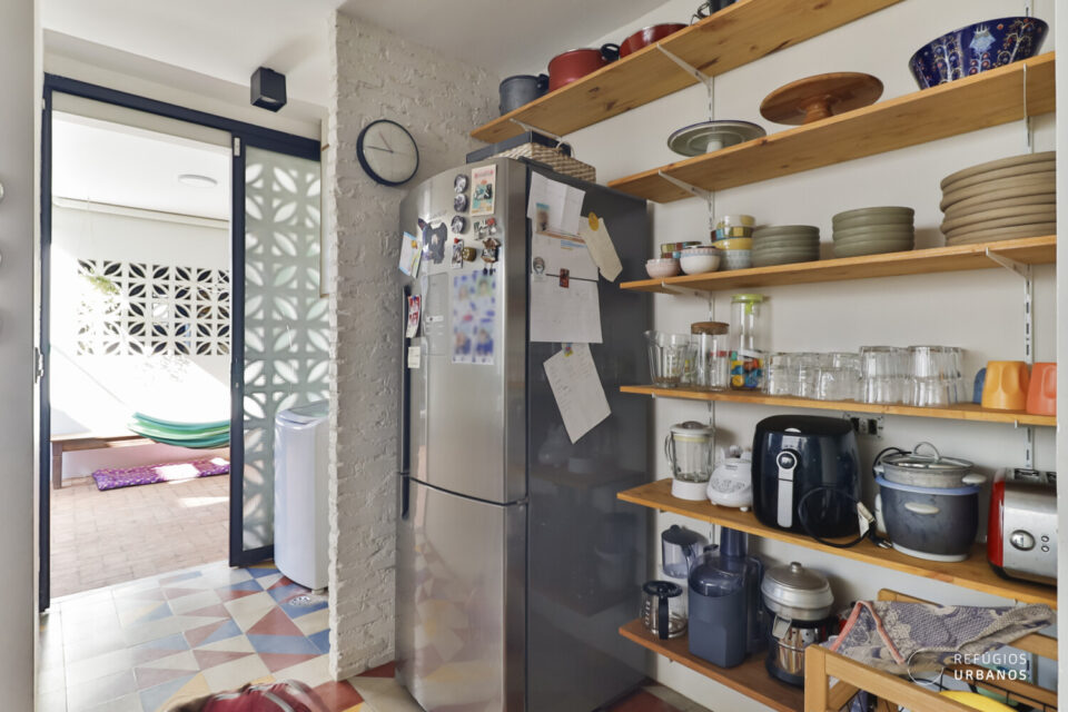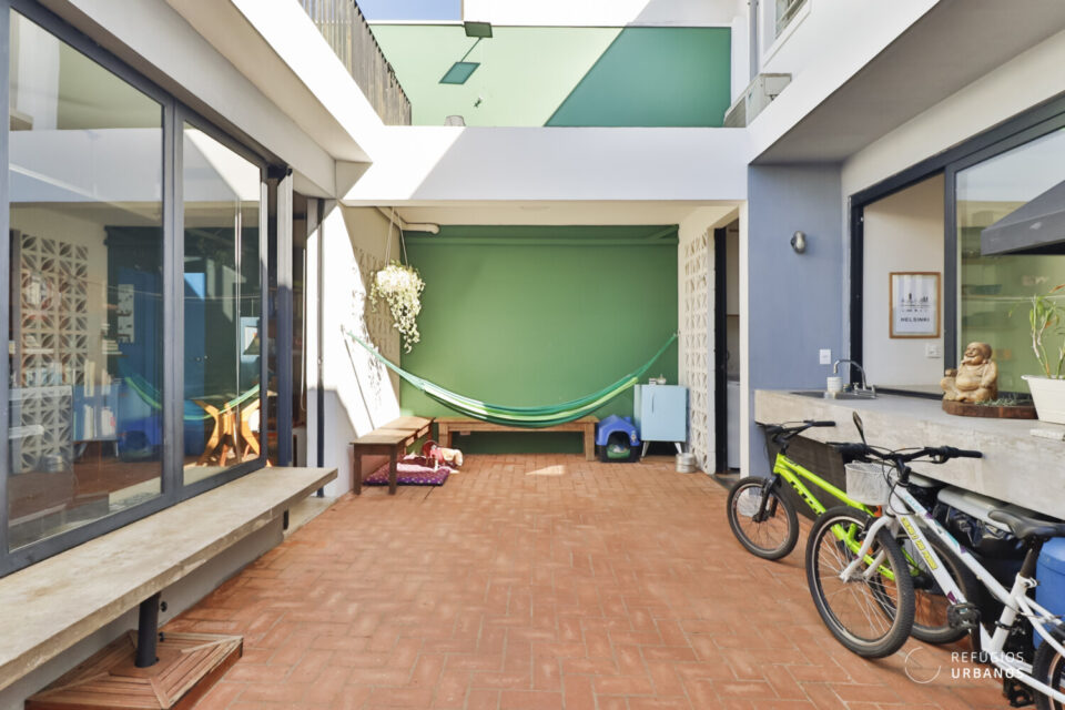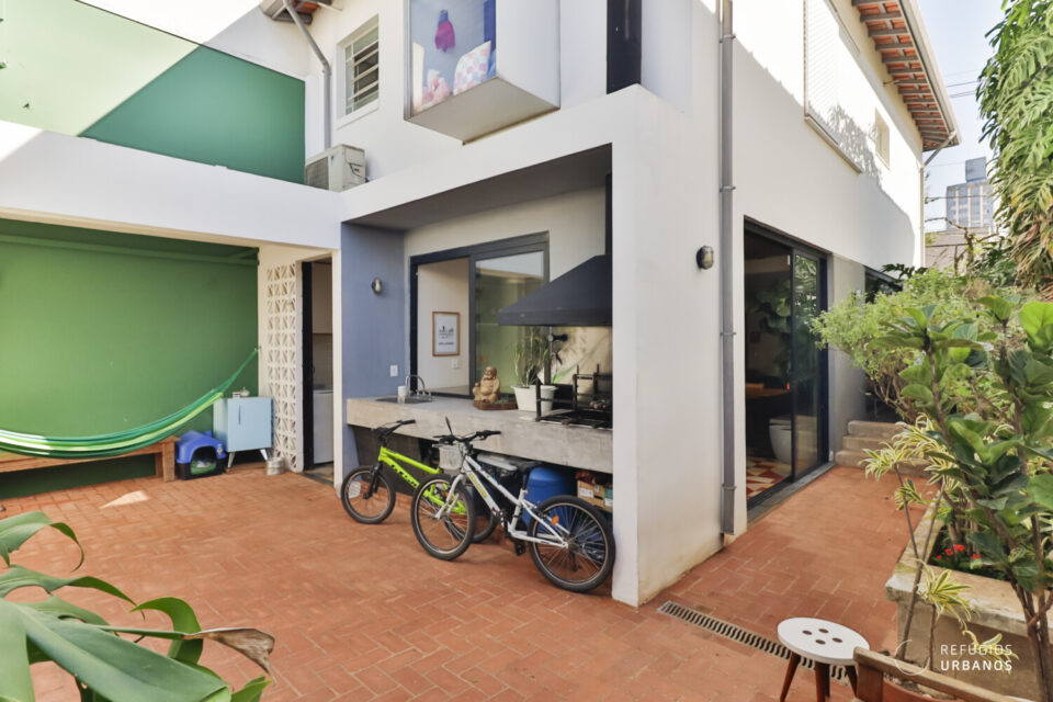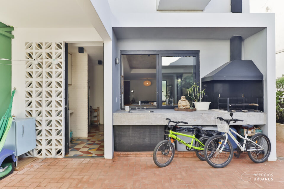 Em seguida, na área externa, uma senhora edícula, que pode funcionar como home office, ateliê ou quarto de brinquedos. O quintal gourmet e a cozinha são integrados, criando mais um espaço perfeito para convivência.
