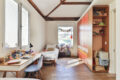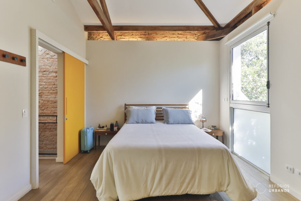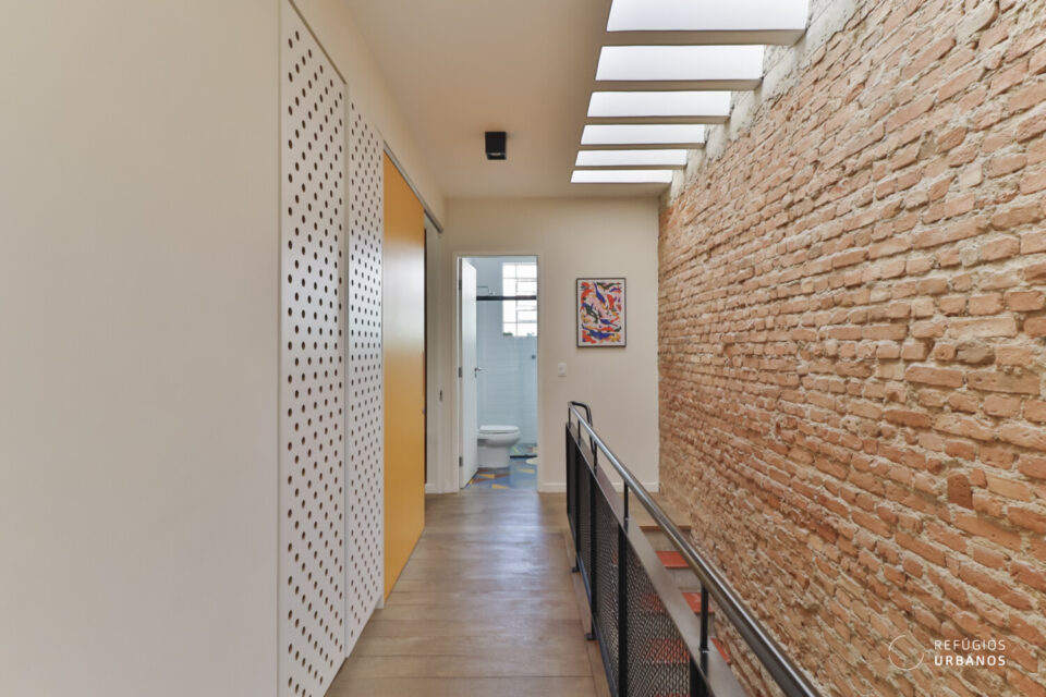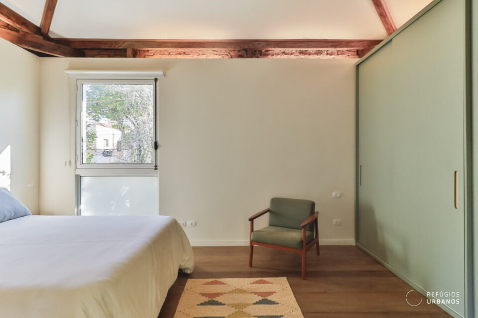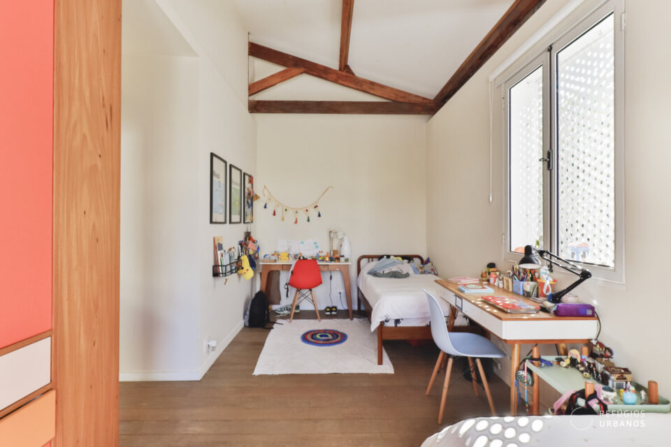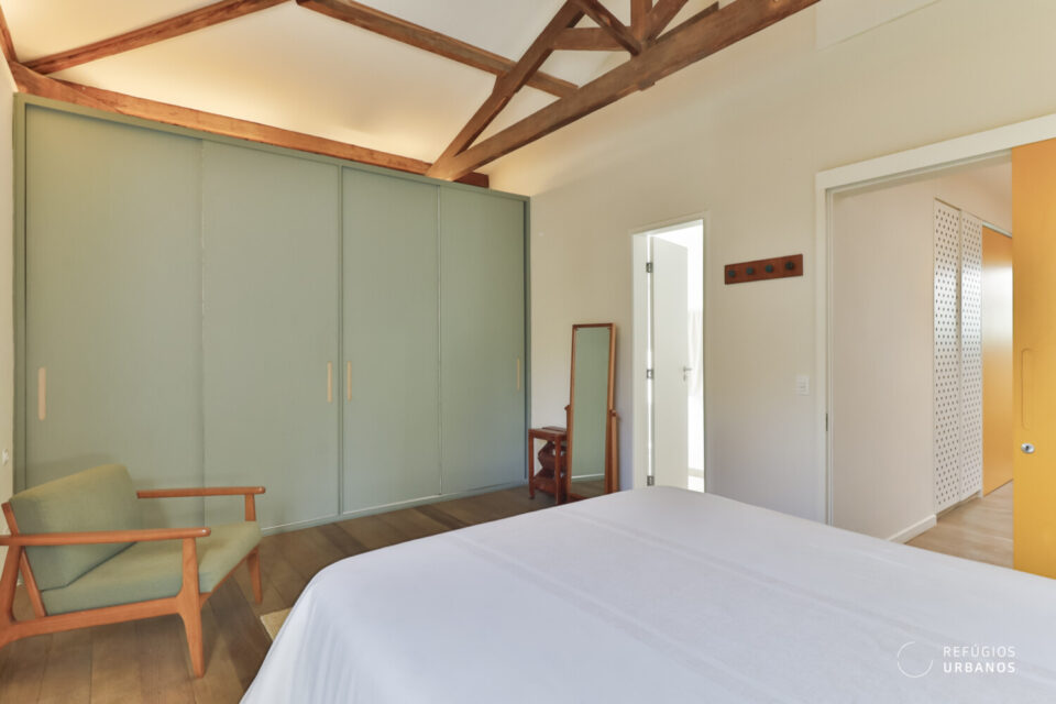 No pavimento superior, a área íntima abriga uma suíte espaçosa com um super banheiro: pé-direito alto, acabamento em madeira com estrutura em tesoura aparente, piso de madeira e marcenaria sob medida.