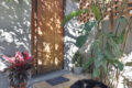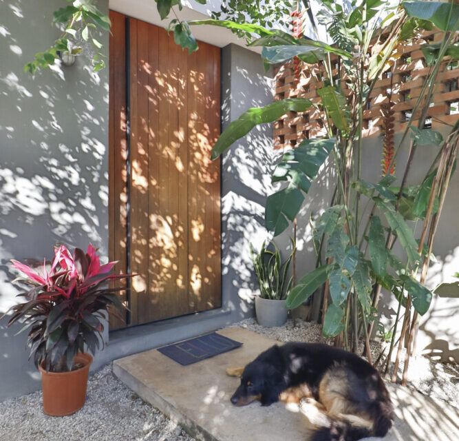 Primeiramente, uma ampla porta de madeira e um paisagismo exuberante dão as boas-vindas.
