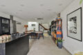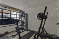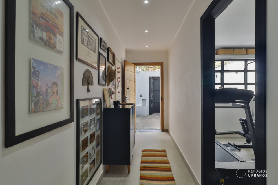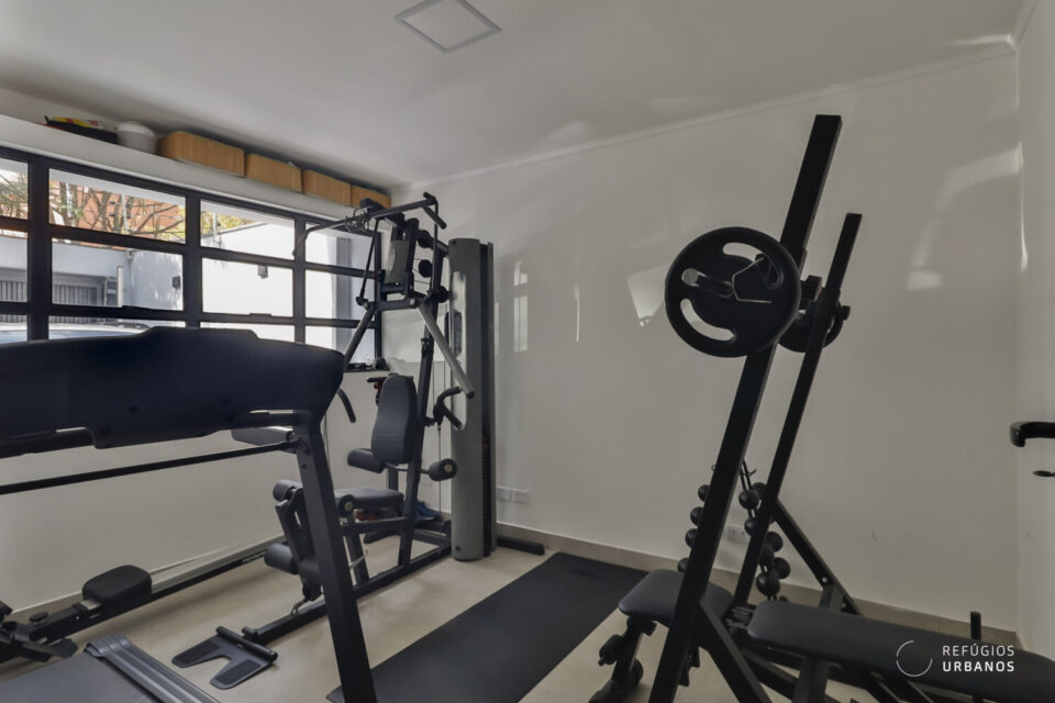 Logo na entrada, somos recebidos por um espaço que hoje abriga uma academia, mas que pode ser adaptado à sua necessidade, possibilitando acolher, por exemplo, um escritório ou um ateliê.