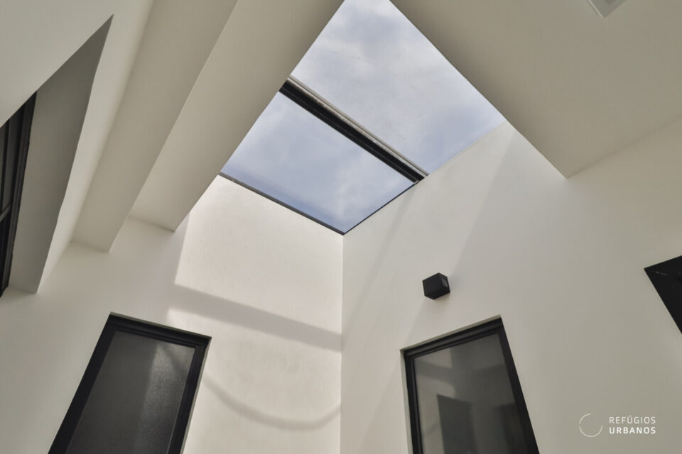 A integração e o uso da claraboia e do piso de vidro no centro da casa foram fundamentais para permitir a passagem de luz e de sol para o espaço térreo.