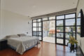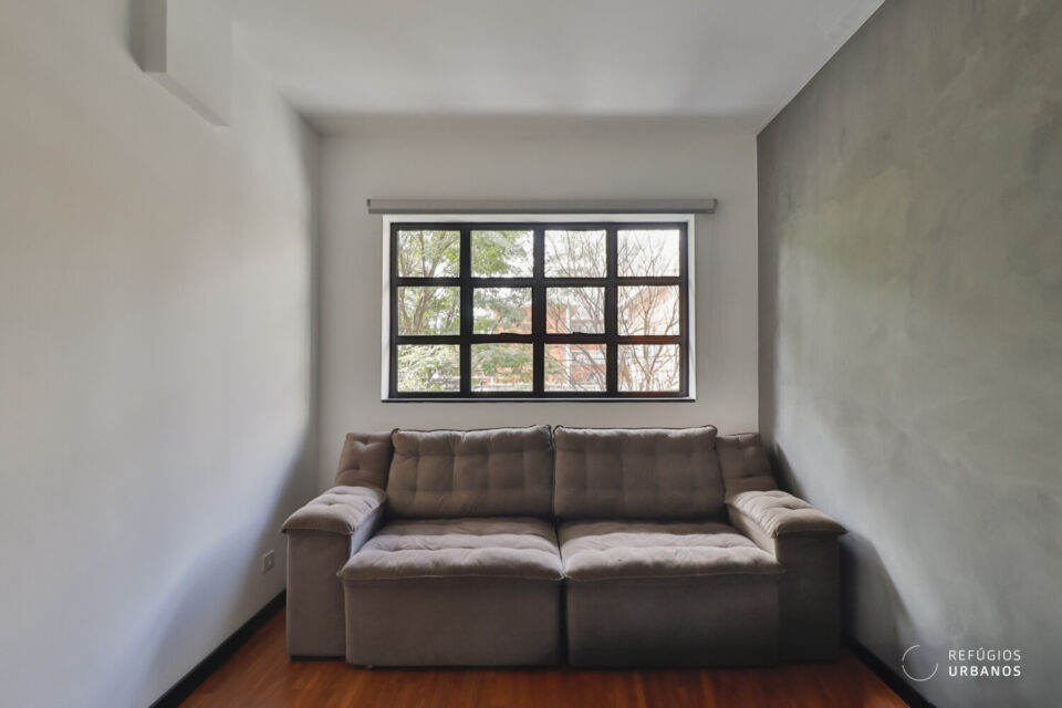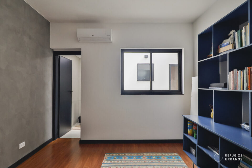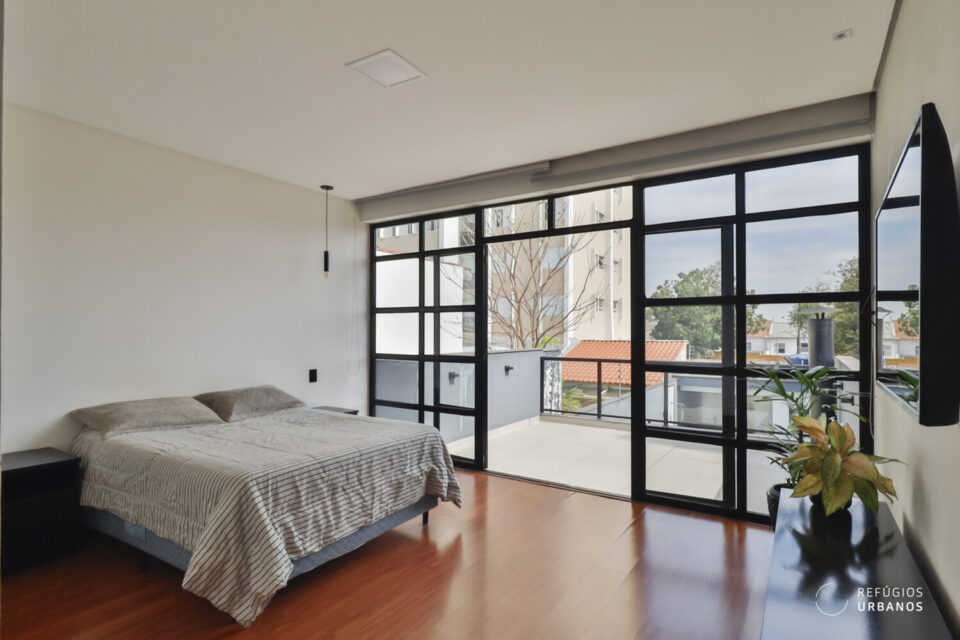 Primeiramente, a suíte da frente é bem iluminada, com uma ampla janela que emoldura a copa das árvores.