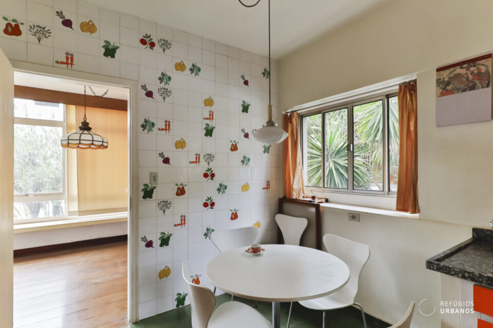 A cozinha, ampla e cheia de personalidade, combina azulejos com estampas de legumes e portas cor de laranja nos armários — um toque retrô encantador.