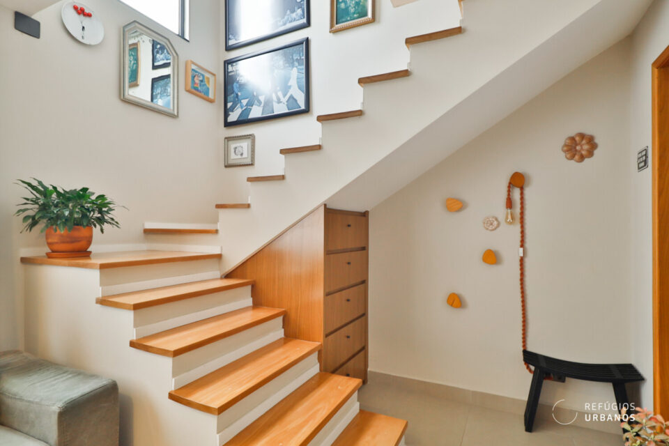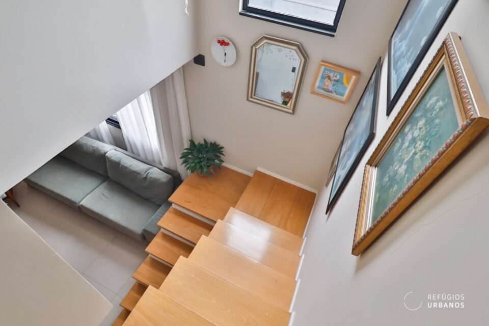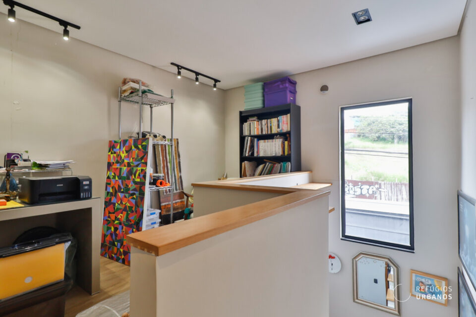 Primeiramente, da sala, uma escada conduz ao rooftop, onde hoje funciona um escritório com vista e muita luz natural. Esse espaço tem um potencial incrível de transformação.