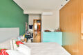 Logo ao entrar, a sala ampla e integrada à cozinha revela um espaço fluido e acolhedor. A integração permite que a sala acomode confortavelmente dois ambientes em “L”, seja para estar e jantar ou para criar configurações personalizadas de acordo com o seu estilo de vida, e ainda um lavabo estrategicamente posicionado.