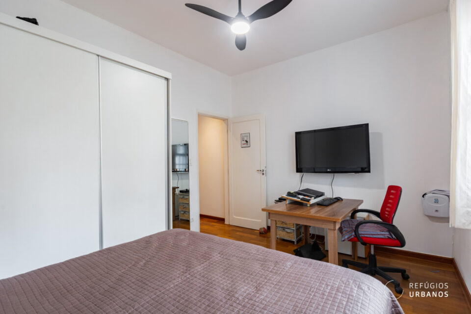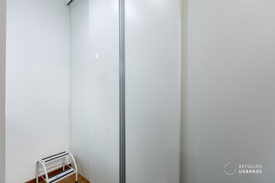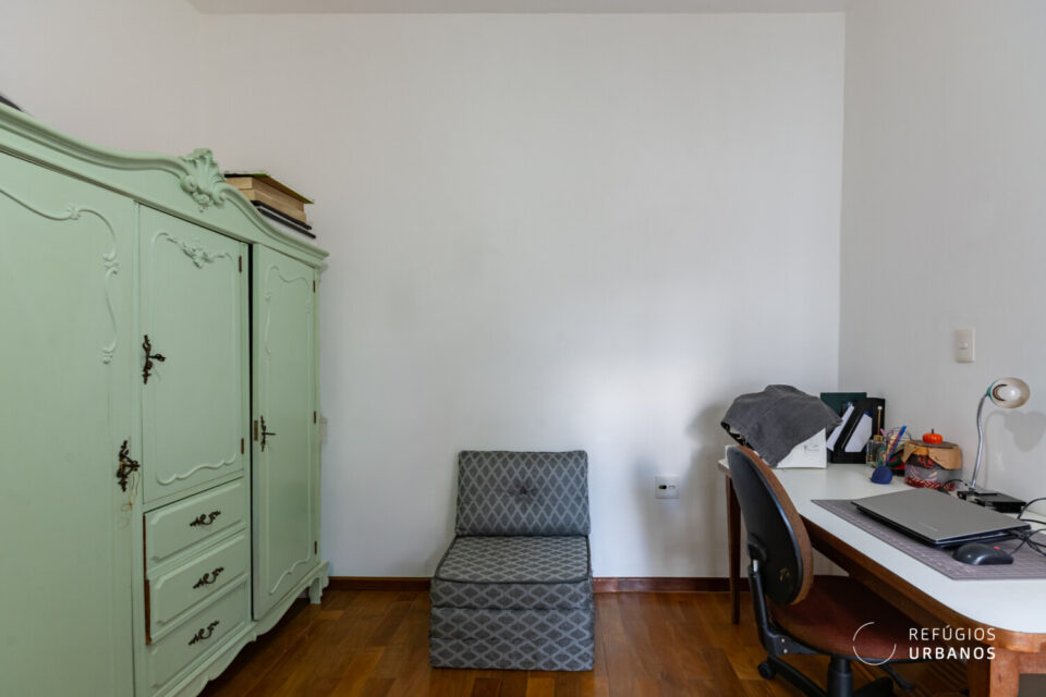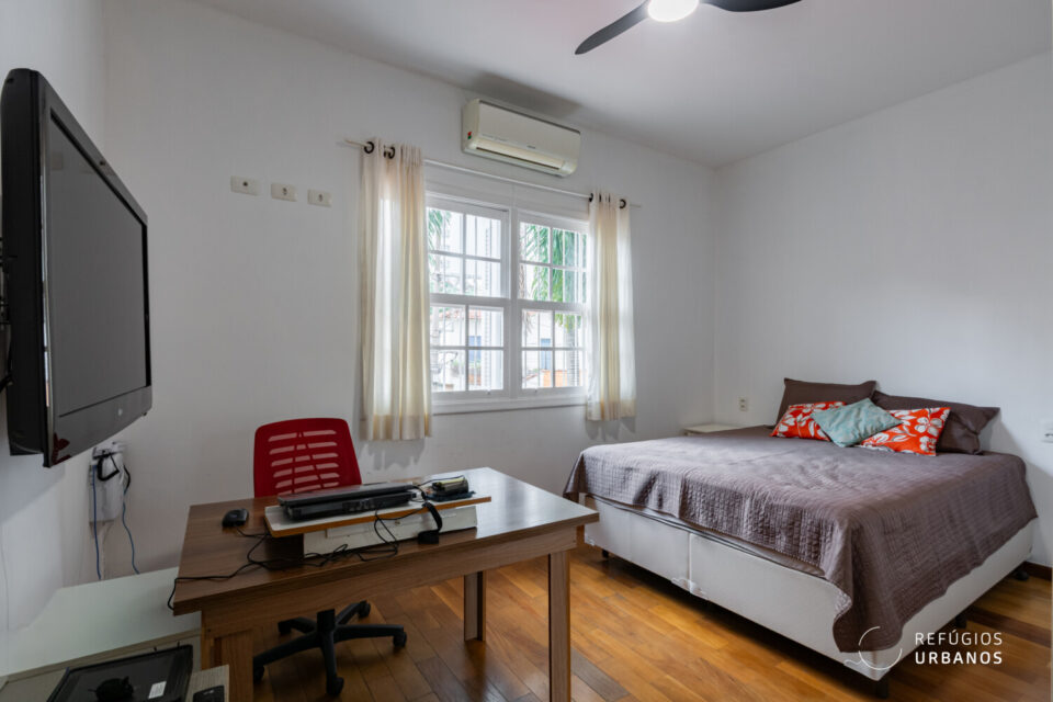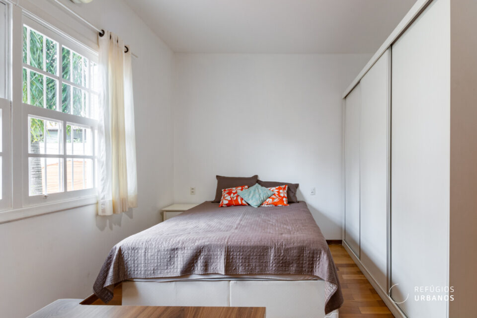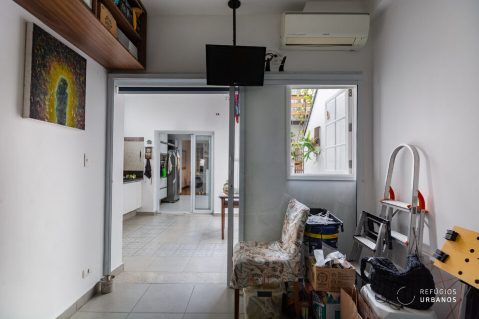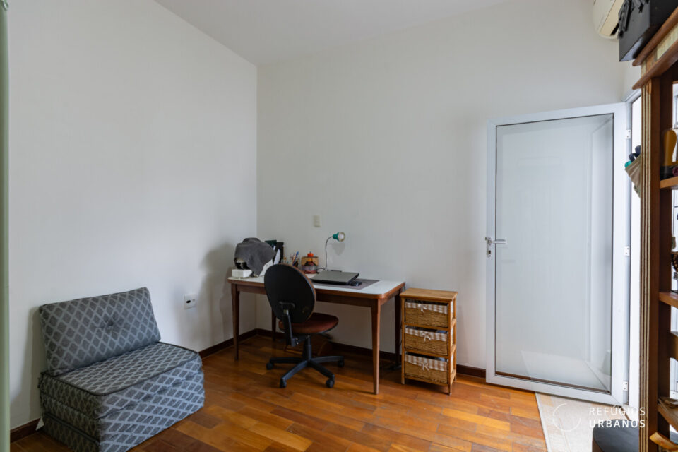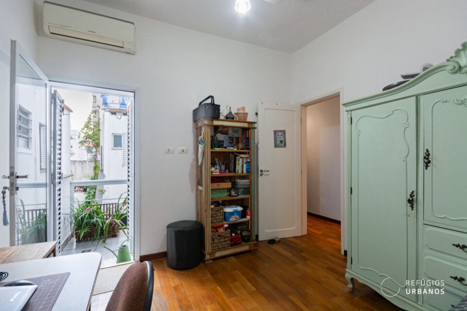 Do mesmo modo, o segundo dormitório é hoje um ateliê, mas poderia ser quarto de criança, sala de jogos ou qualquer coisa que a imaginação mandar, e ainda tem acesso a uma pequena varanda voltada para o quintal, o que é um charme à parte.