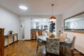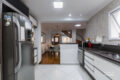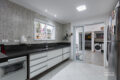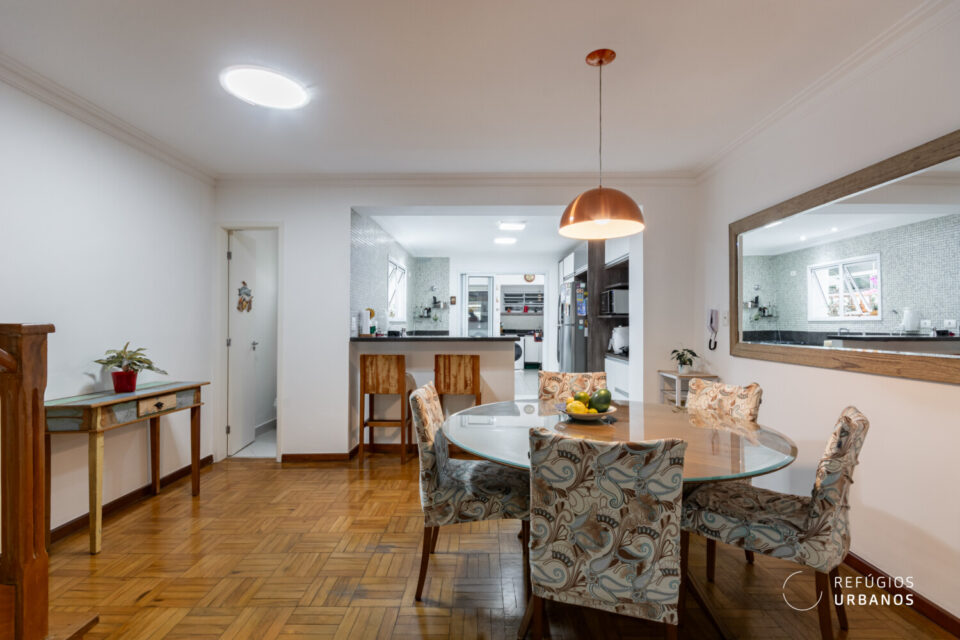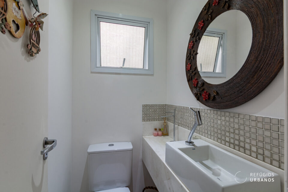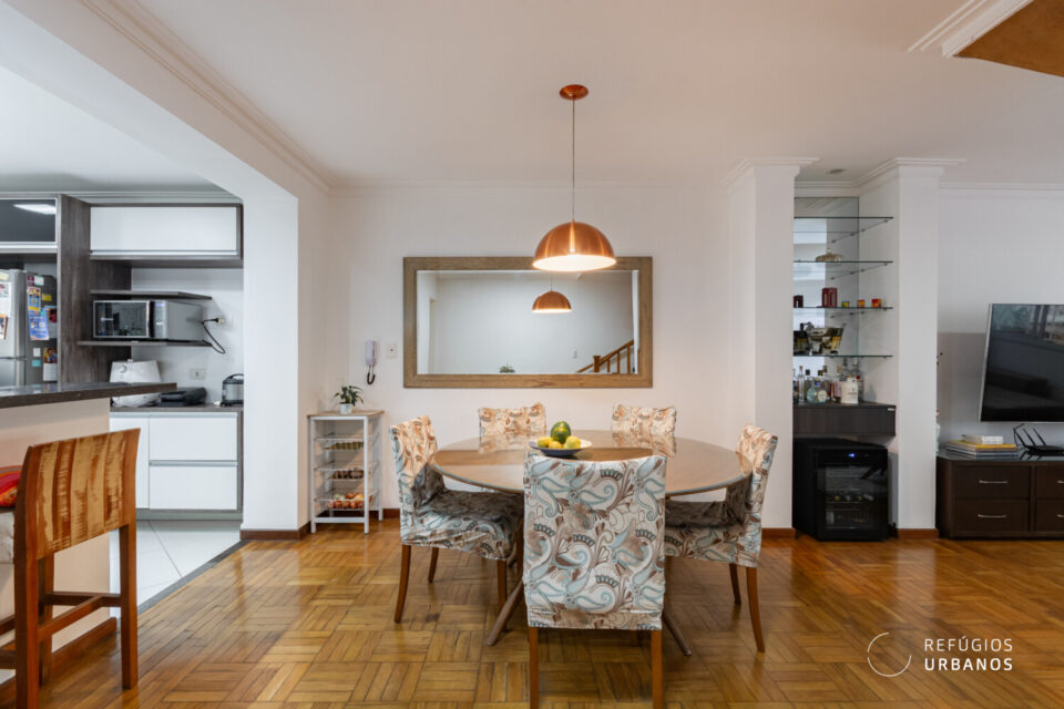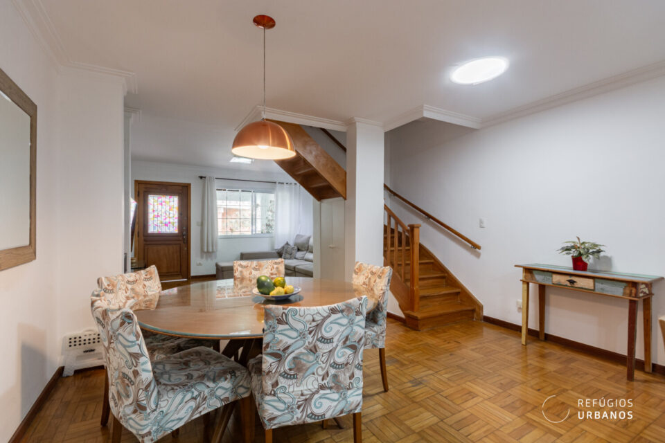 A sala de jantar comporta uma mesa para 8 lugares, ou seja, fim de semana com a família toda está garantido. Ao mesmo tempo, a cozinha integrada com armários planejados mantém tudo funcional e bonito. Temos ainda um lavabo que completa o pavimento inferior para receber as visitas com conforto.