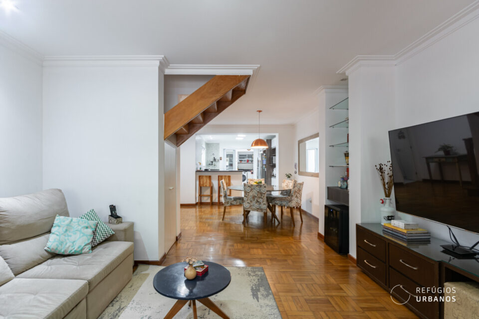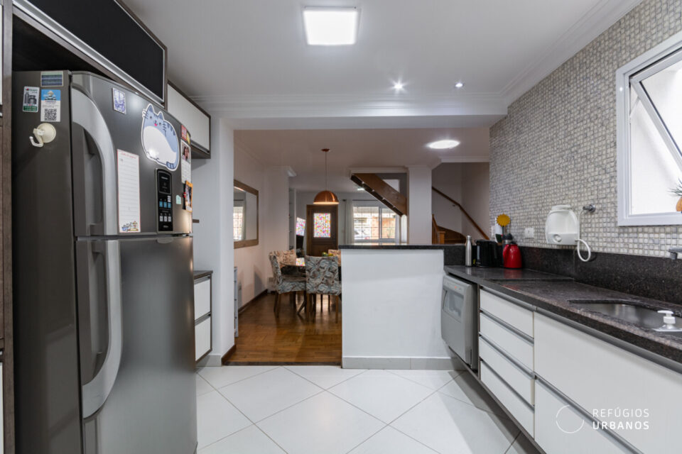 Primeiramente, a sala ampla e integrada à cozinha acolhe com generosidade. O janelão traz luz e ventilação, e o armário embaixo da escada resolve aquela bagunça do dia a dia com muita elegância! Quem tem filhos sabe do que estamos falando :)