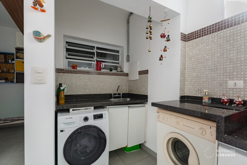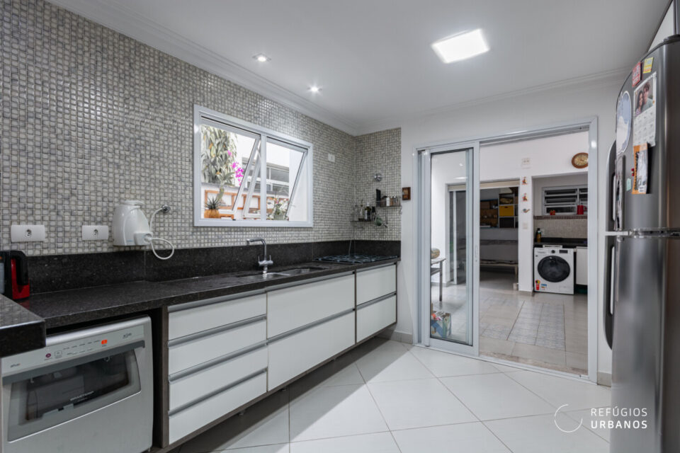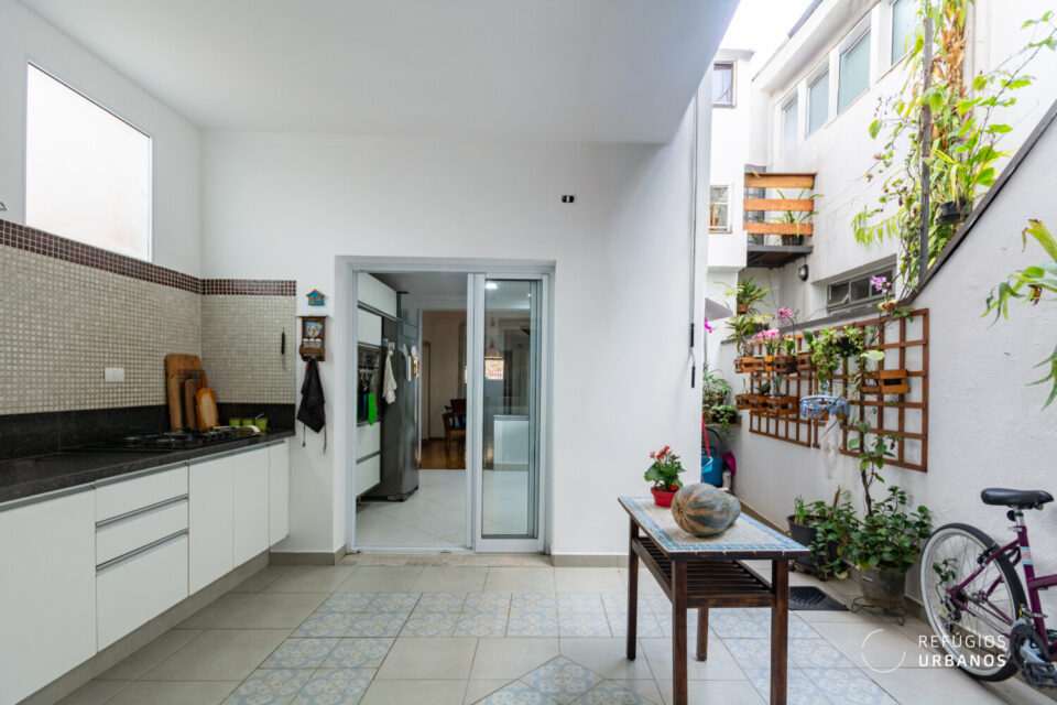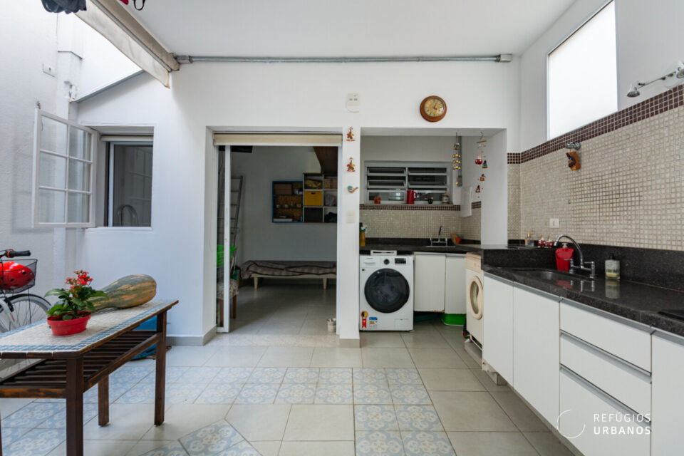 A maior parte foi coberta e virou uma extensão natural da cozinha: bancada com armários, fogão e lavanderia: tudo integrado e muito bem resolvido. Juntamente com isso, temos a edícula com banheiro completo e ar-condicionado, hoje usada como escritório, mas que pode facilmente virar ateliê, sala de música ou quarto de hóspedes.