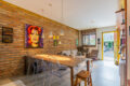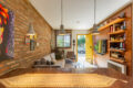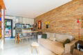 Mas ao entrarmos, o encantamento é ainda maior. Um dos objetivos na reforma era aproveitar bem cada espaço da casa, então temos aqui sala e cozinha integradas, além de algumas soluções inteligentes. Por exemplo, a entrada do lavabo social foi discretamente disfarçada pelo painel/estante do espaço de estar. Dessa forma, temos uma sensação de continuidade e amplitude nos ambientes.