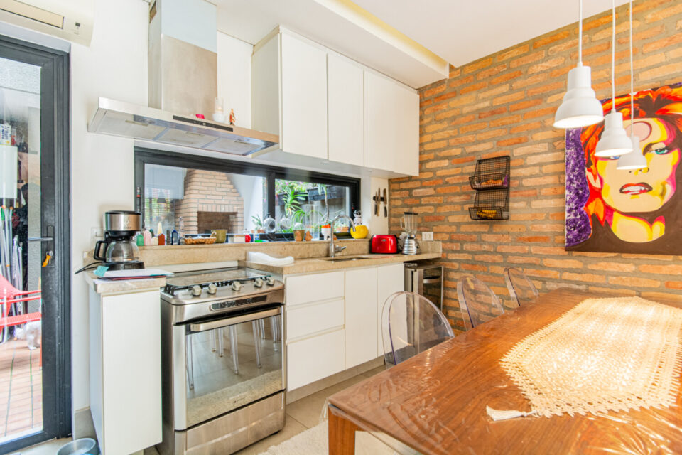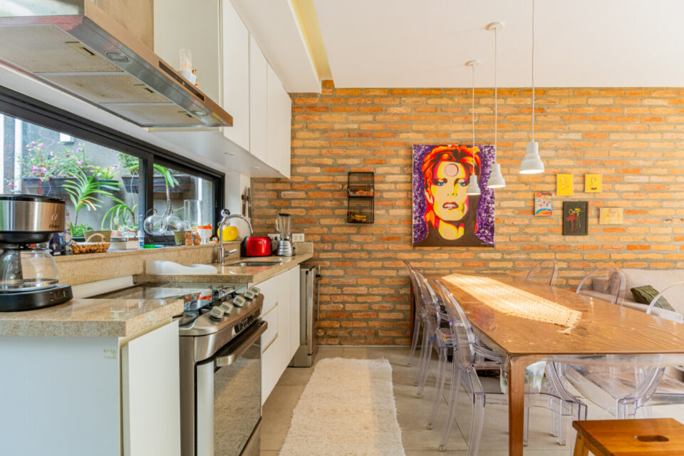 Em seguida, uma porta nos leva até o quintal, sem dúvidas a cereja do bolo da casa. Temos o espaço perfeito para quem gosta de receber e curtir um belo churrasco. Ainda nesse espaço fica a lavanderia, aberta e com marcenaria. Desse modo, todo o espaço do quintal pode ser utilizado de forma mais confortável.