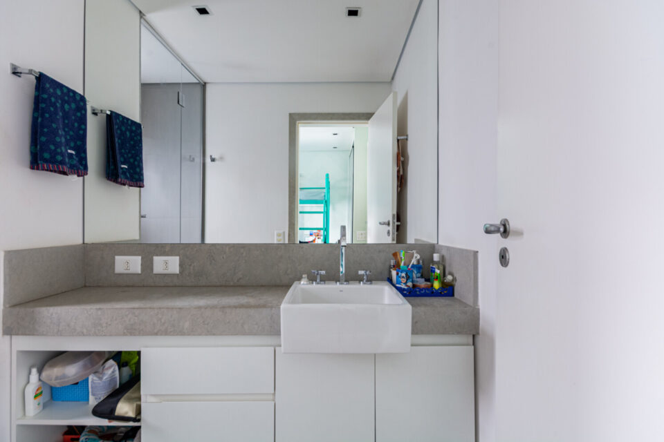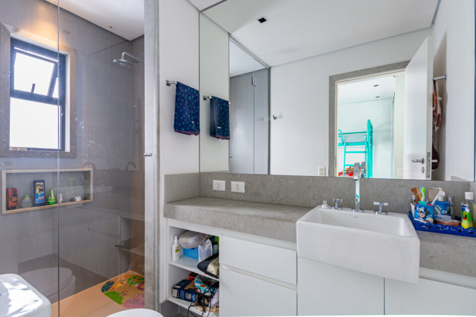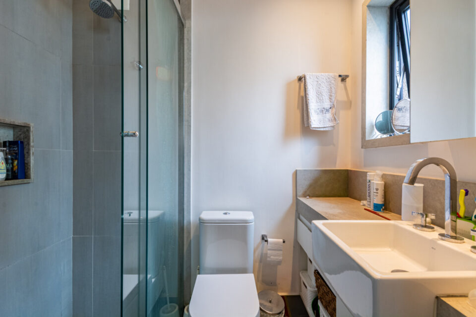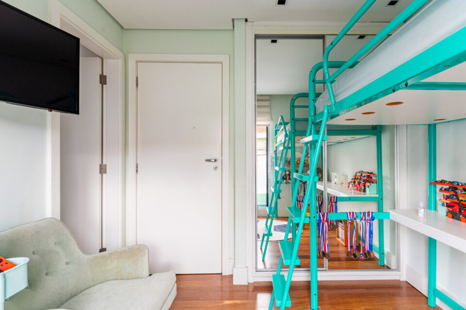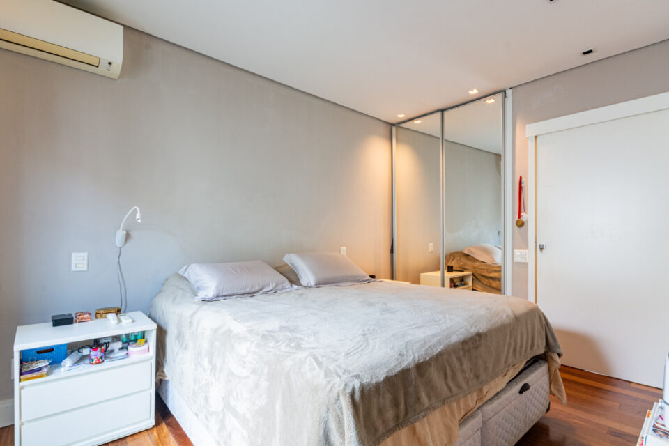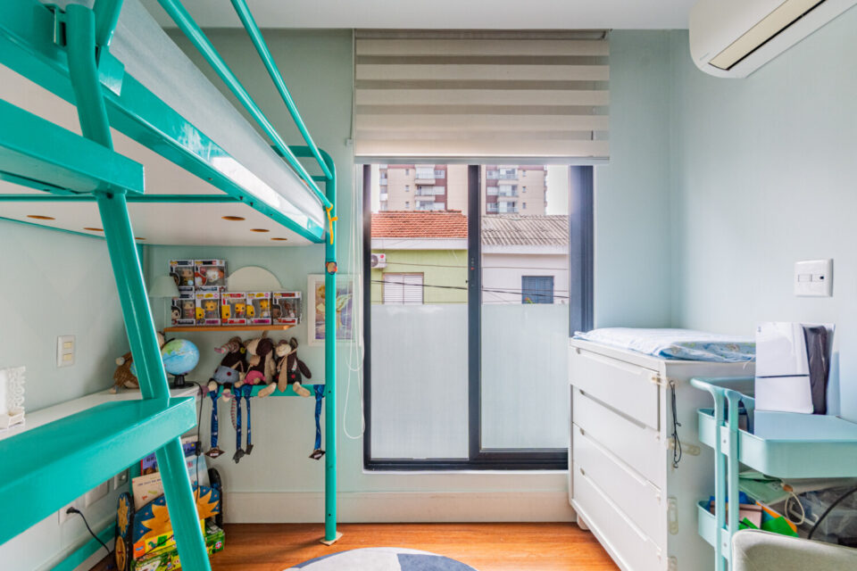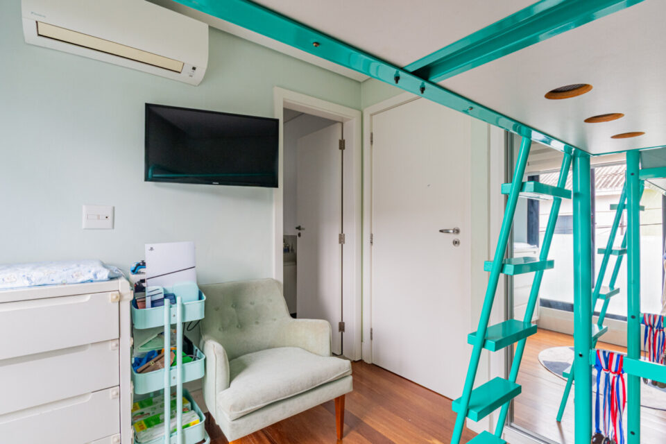 No piso superior temos as duas suítes – algo raro quando falamos de casa de vila. O maior dos quartos é a suíte do casal, que surpreende pela quantidade de armários. O segundo dormitório, também possui um amplo guarda-roupa embutido.