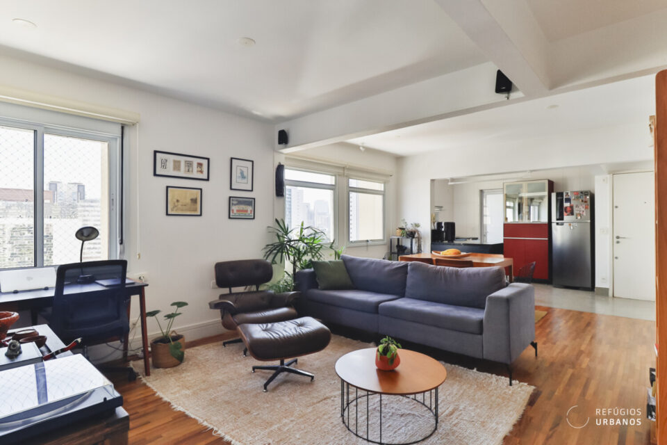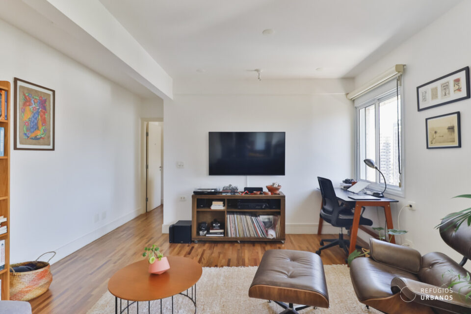 A sala é bastante espaçosa, pois a planta versátil permitiu que um dos quartos originais fosse aberto, priorizando, assim, a metragem dedicada ao living. Além disso, essa alteração é facilmente revertida, caso você deseje, seja com uma parede de drywall ou até mesmo uma divisória de correr, que pode ser bastante charmosa.