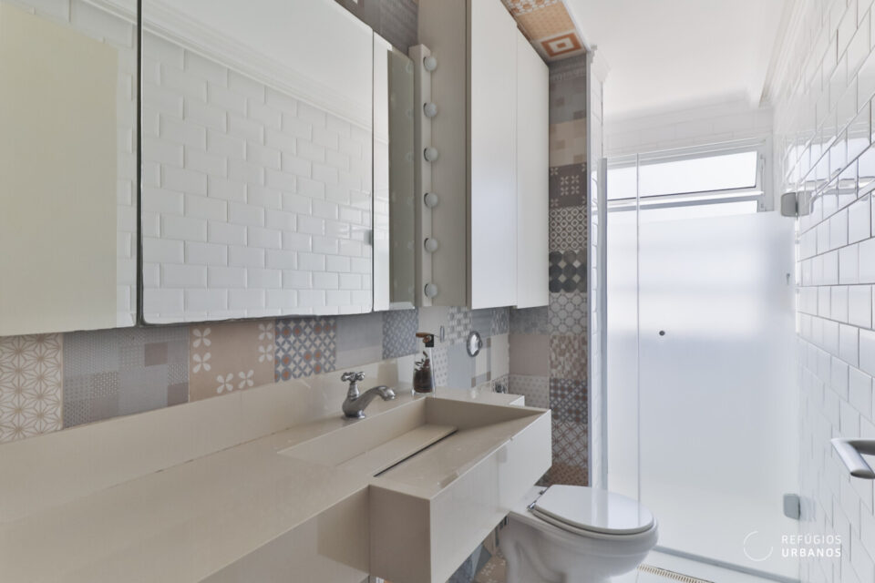 Além disso, o banheiro, está um charme, com ladrilhos hidráulicos e azulejos tipo metrô white. A pia, com bancada de porcelanato cor creme, e a marcenaria são de excelente qualidade.
