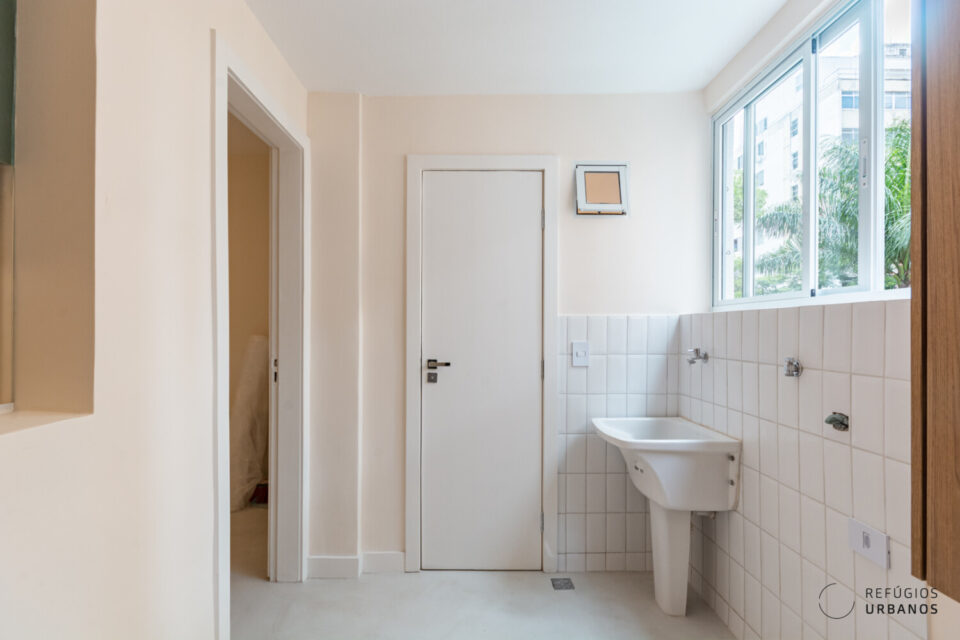 A área de serviço é outro ponto de destaque, ampla e ventilada, completa com aquecedor a gás, além do quarto de serviço, que pode ser usado como escritório também.