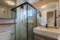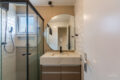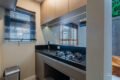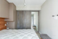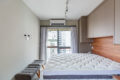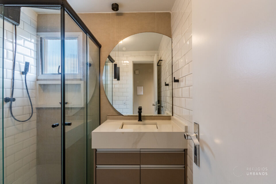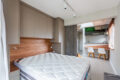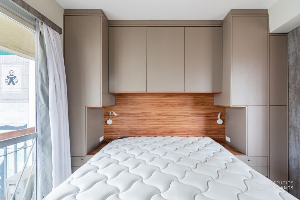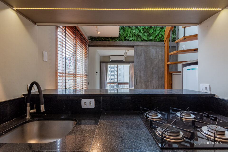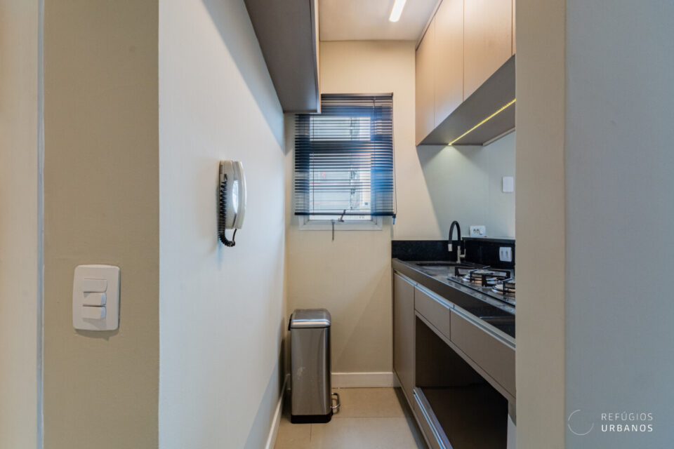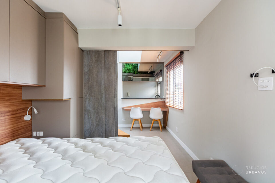 Entramos, e logo nos deparamos com um banheiro completo à esquerda. Na sequência, um corredor ate a cozinha. Moderna, pratica e com marcenaria de qualidade. Além do bom gosto, ainda conta com um balcão de madeira com 2 cadeiras charmosas. Além disso, o balcão é iluminado por uma grande janela com persiana de madeira. O que nos leva, a uma porta de correr em marcenaria, no tom cimento queimado. E, na sequencia, a um aconchegante quarto. Com nada menos, que uma marcenaria completa e também uma iluminação funcional projetada. E, por fim, para os dias de verão, contamos com um ar condicionado potente e inverter/econômico, para todo o ambiente do primeiro andar.