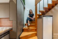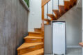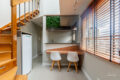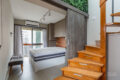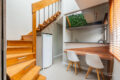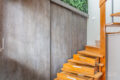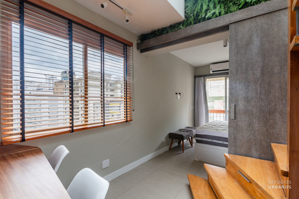 Subimos por uma escada bacana de madeira para a cobertura. Além da escada, temos 3 degraus que são gavetas, praticamente invisíveis, se não fosse o puxador minimalista, que dá a dica.