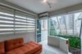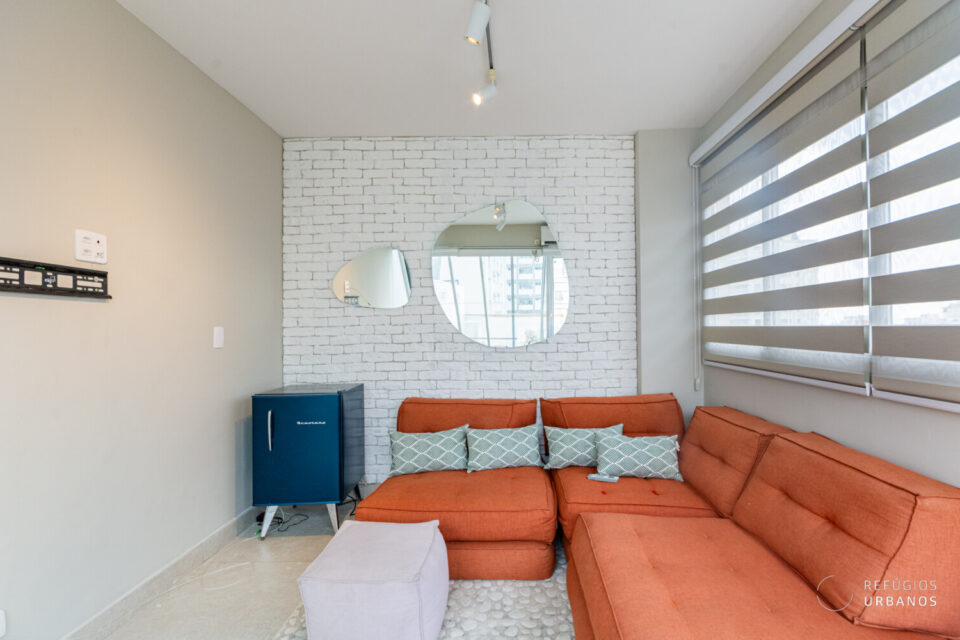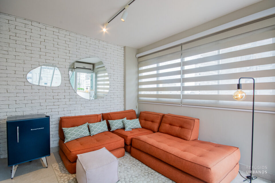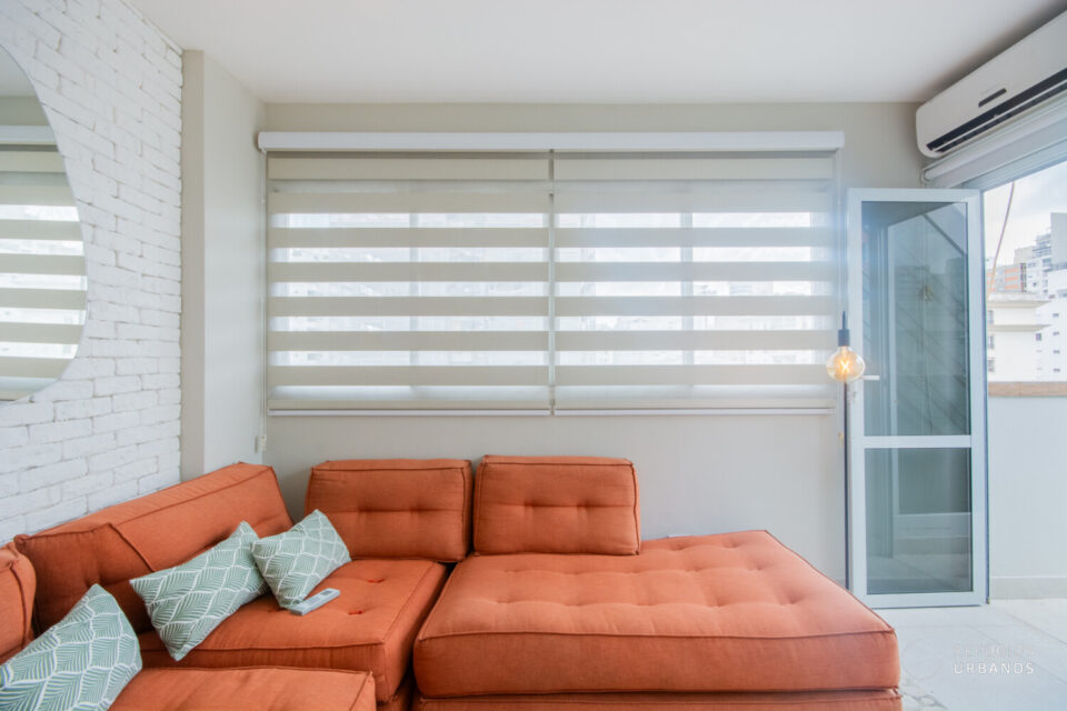 Logo que chegamos, nos deparamos com uma sala espaçosa e aconchegante. Além de um janelão atras de um sofá moderno, e que portanto nos convida a sentar. No entanto, a lateral é envidraçada e com vista para a área externa. Quer fazer um Home? Pensando nisso, as cortinas blackouts rolô, que transformam o ambiente em sala de cinema. E, nada menos, que um ar condicionado potente e Inverter, que esfria todo o ambiente ao longo das estacões do ano.
