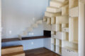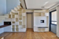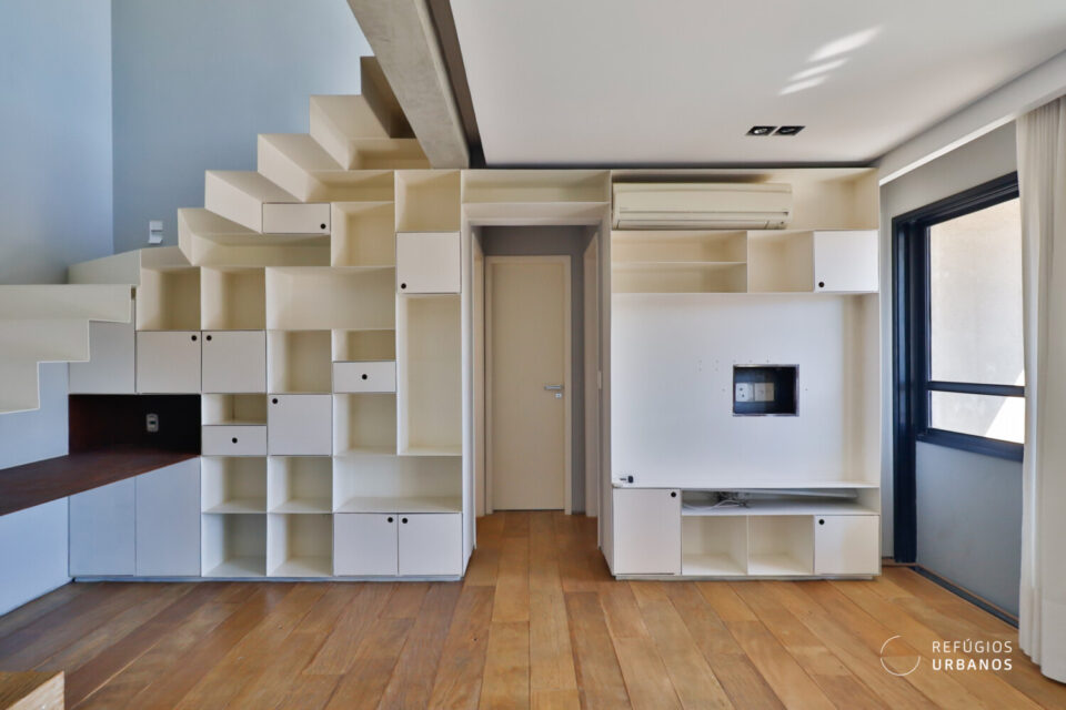 A sala e a cozinha são integradas integradas no primeiro pavimento, onde existe também uma bancada de trabalho. Desta forma, há amplitude e funcionalidade. Estantes e nichos foram feitos sob medida, e, assim, há espaço de armazenamento com assinatura de estilo. Já a varanda é a área perfeita para um café da manhã aproveitando a vista.
