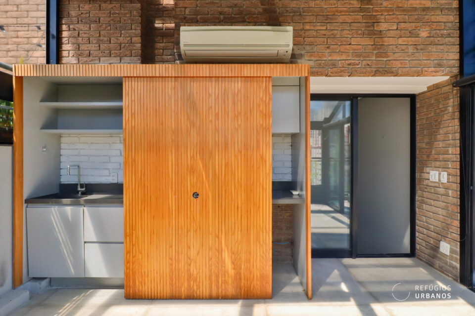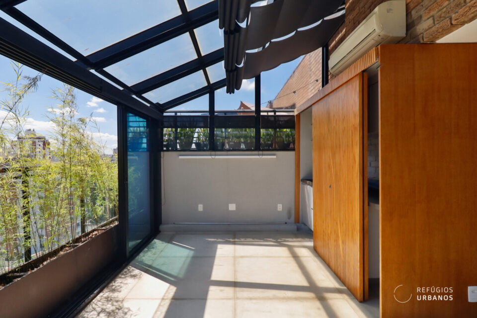 No momento em que subimos a escada metálica chegamos em uma sala ideal para relaxar ou receber os amigos. O ambiente é todo envidraçado e tem vista do bairro. As portas de vidro se abrem para garantir ventilação natural ou fecham totalmente para uso do ar condicionado.
