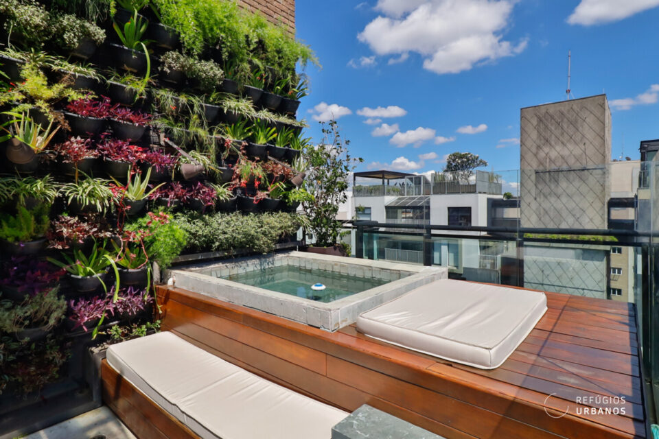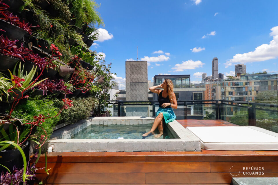 A piscina em pedras vulcânicas o jardim vertical (com irrigação) roubam a cena aqui. Aliás, a piscina é aquecida e, portanto, te acompanha em todas as épocas do ano e climas.