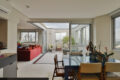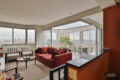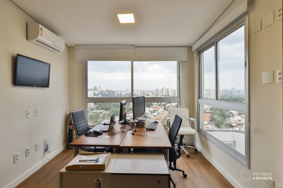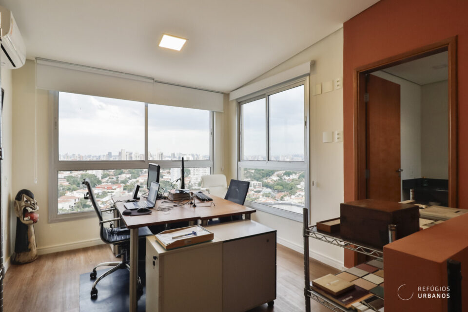 Por fim, o terceiro pavimento revela uma surpresa: mais uma suíte envidraçada. Um espaço amplo, confortável e versátil que pode assumir diferentes usos. Na configuração atual, ele funciona como um home office. A vista daqui é inacreditável, transformando este último nível em um verdadeiro refúgio dentro da cidade.