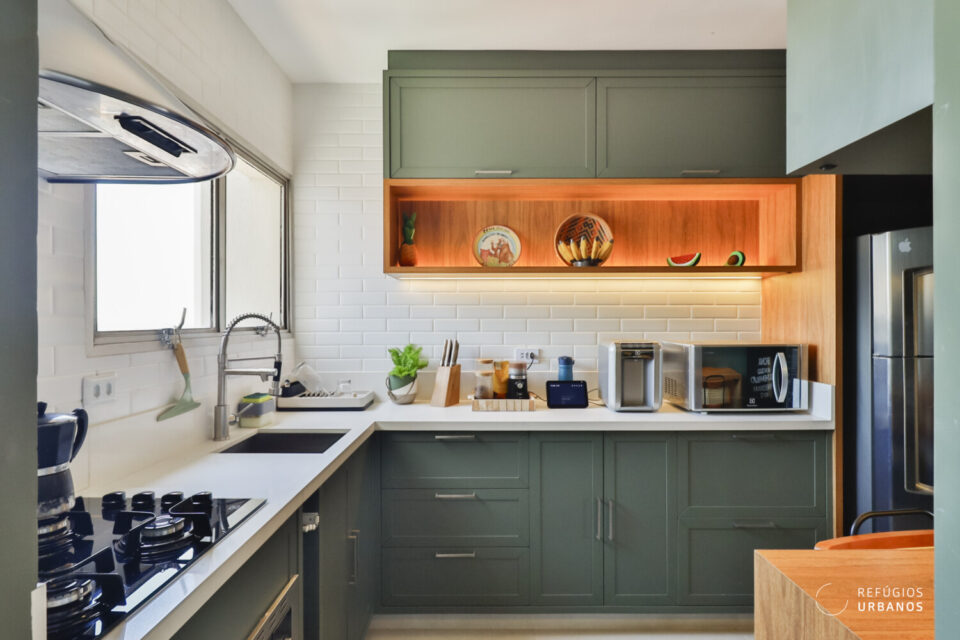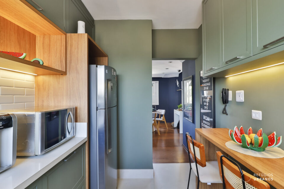 Logo depois a cozinha, toda reformada, bem equipada e abastecida em marcenaria. Aqui é super iluminado e ventilado! E já de cara percebemos o capricho na reforma em todos os detalhes. Em seguida uma área de serviço e um banheiro .