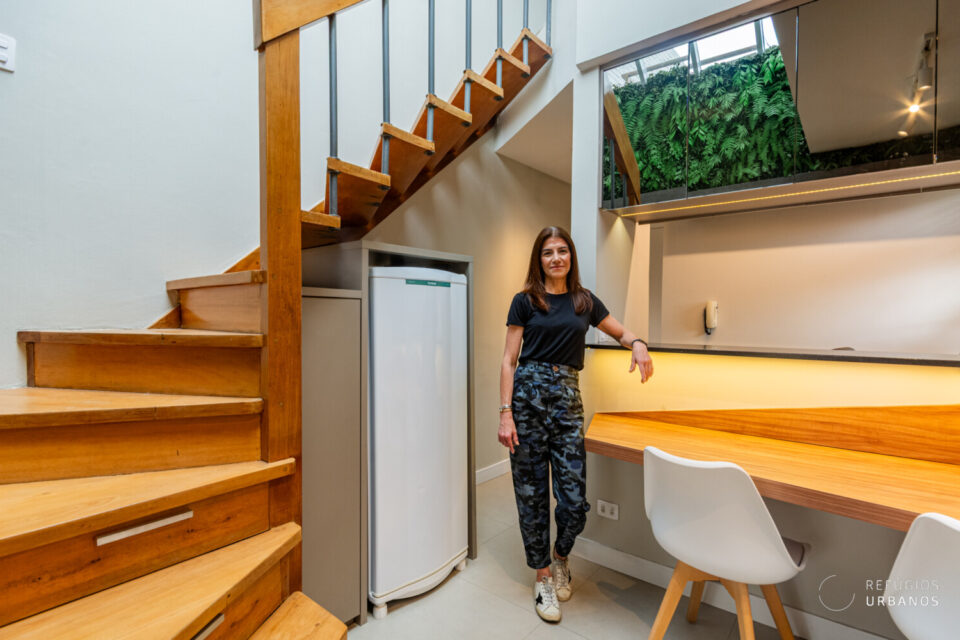 Subimos por uma escada bacana de madeira para a cobertura. Além da escada, temos 3 degraus que são gavetas, praticamente invisíveis, se não fosse o puxador minimalista, que dá a dica.