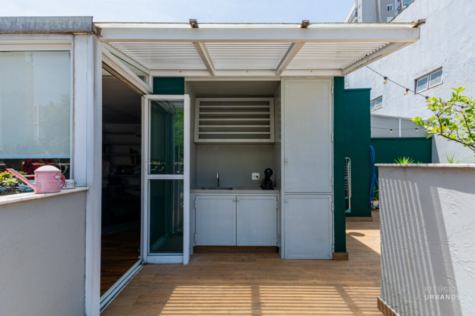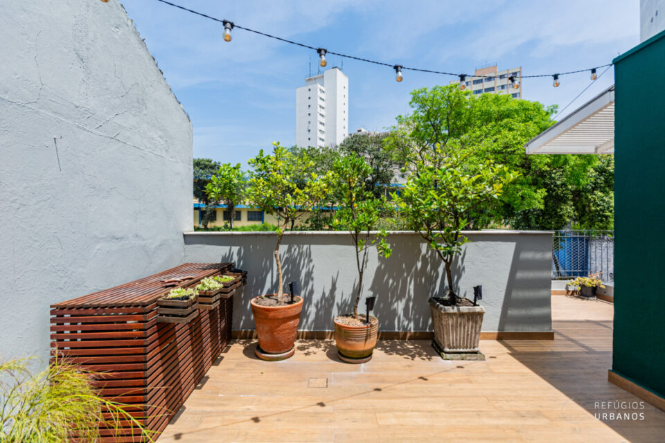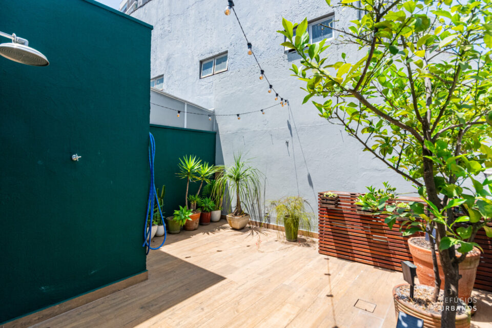 Dele, acessamos um terraço descoberto, com piso de madeira, plantas e um chuveirão, para refrescar os dias quentes.