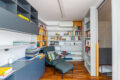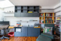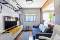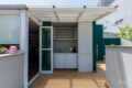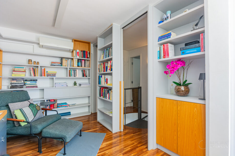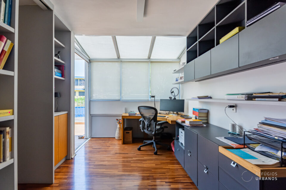 Aqui, existe um espaço de uso flexível, com uma porta de correr e uma persiana, que permite que seja usado para receber hóspedes com privacidade.
