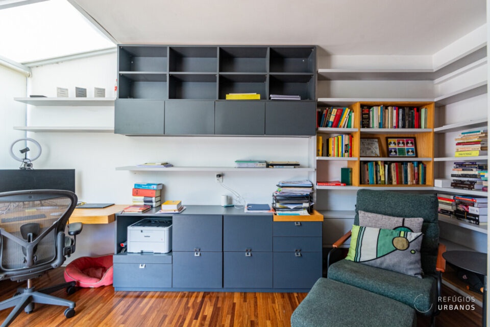 No piso superior, temos outro ambiente de uso flexível, um banheiro e um depósito. Aqui, você pode usar como home office, bem como uma segunda suíte.