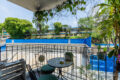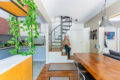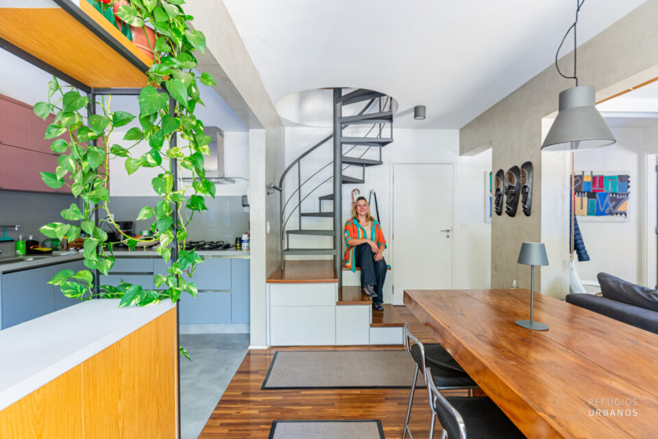 O piso inferior tem uma sala espaçosa com uma varanda charmosa, que, inegavelmente, traz mais verde e iluminação para o interior.