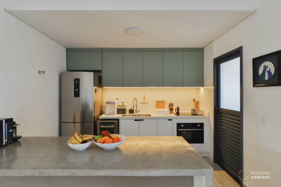 Ao entrar no imóvel, a integração da cozinha com a sala revela um living ampliado e arejado, ideal para encontros com amigos ou momentos em família.