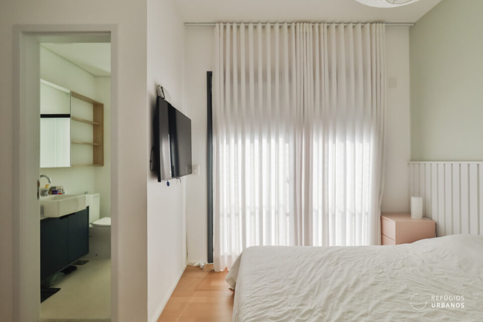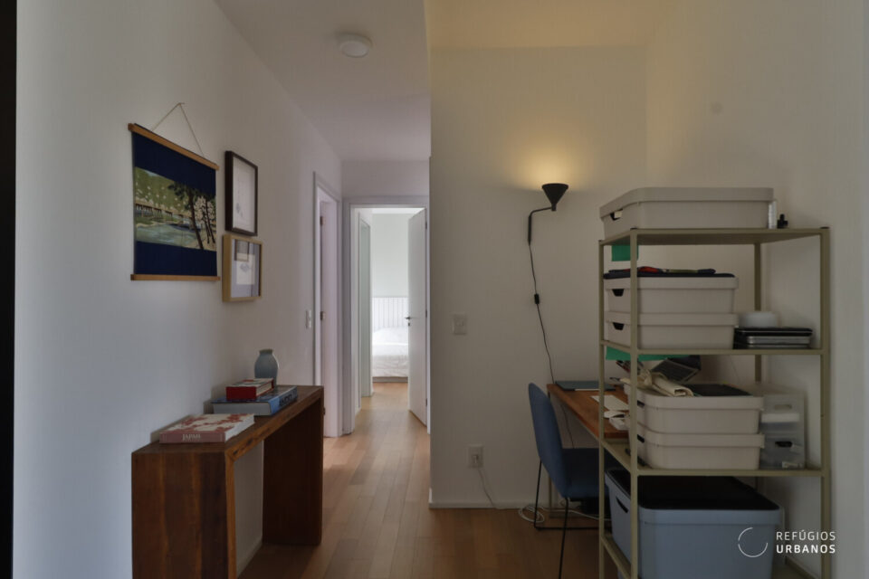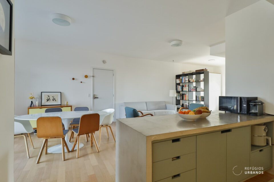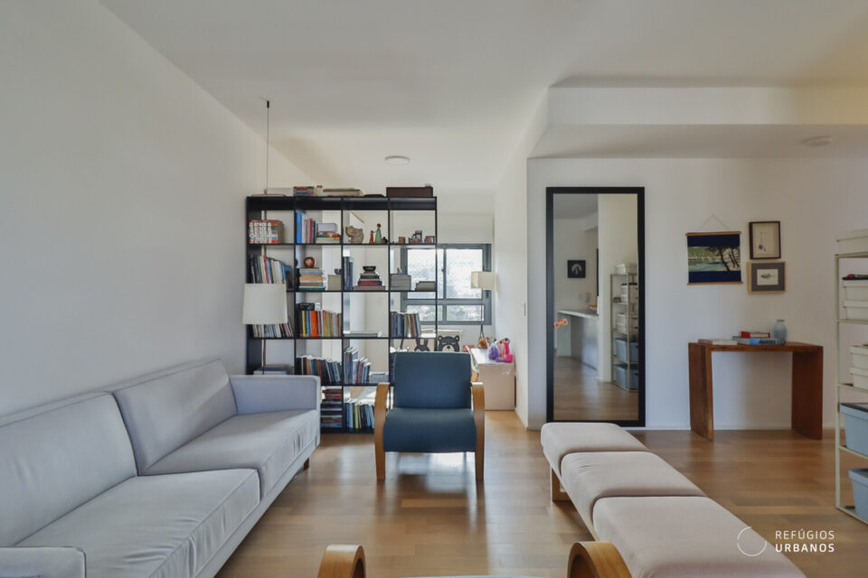 No Momento Mota Pais, Vigliecca soube explorar a elevação natural do terreno para criar ambientes amplos, janelas generosas e frestas de luz. O resultado é um apartamento iluminado, arejado e integrado à paisagem verde que valoriza o charme da Vila Ipojuca.