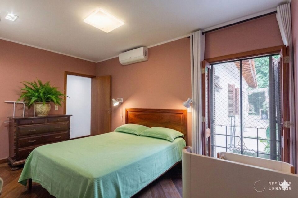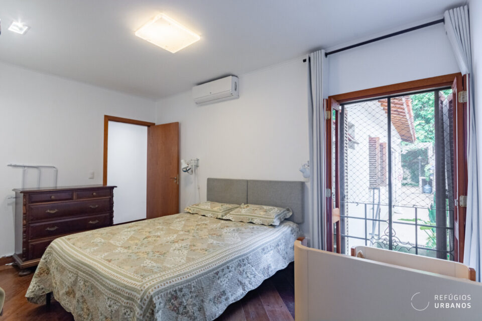 Na sequência, você encontra os dois quartos. O primeiro é a suíte, bem acomodada e com janela para o corredor lateral — o que garante ventilação cruzada e privacidade ao mesmo tempo. O segundo quarto repete a mesma lógica e já conta com toda a infraestrutura para ar-condicionado. Além disso, a suíte também tem ar instalado. Portanto, o conforto térmico aqui não é promessa.