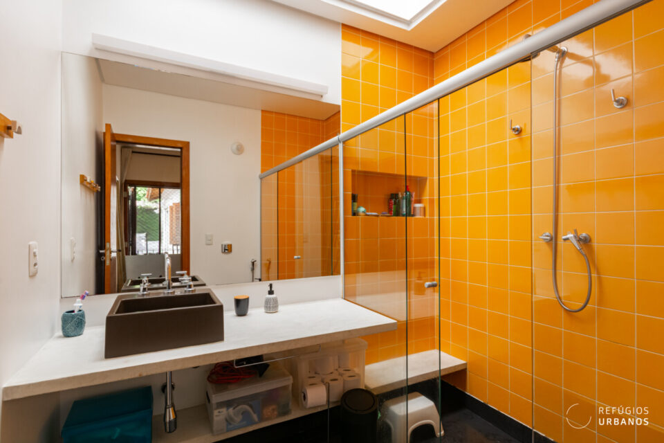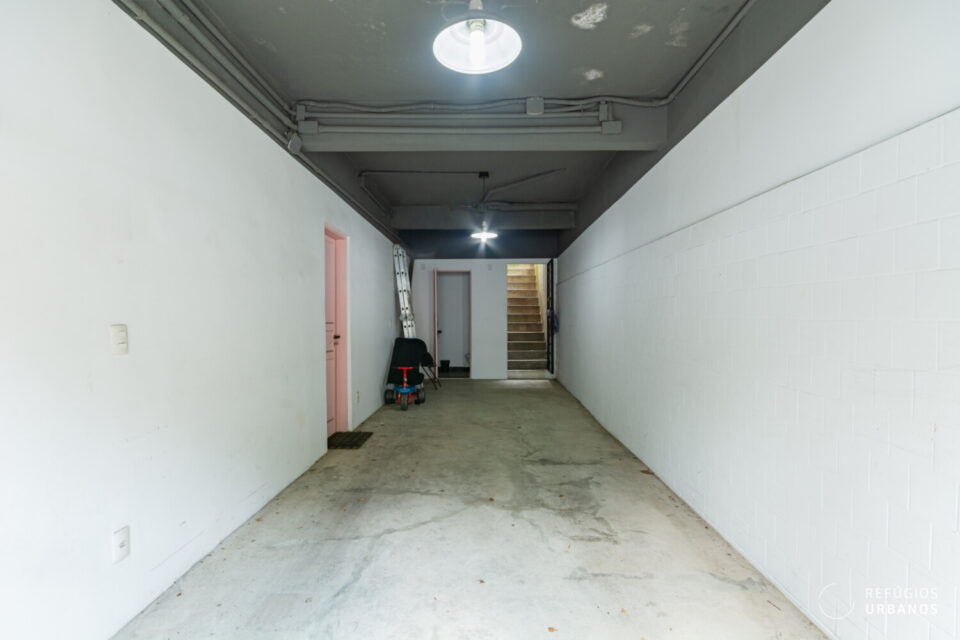 De volta ao corredor lateral, a escada desce até a garagem. Cabem dois carros, um médio e um menor. Mas o que chama mesmo a atenção é o espaço multiuso com entrada independente que fica nesse nível. Hoje ele está disponível e pode virar depósito, ateliê, um home office separado da casa ou até um quarto de hóspedes. Um lavabo completa esse andar. A entrada independente, aliás, é um diferencial relevante, especialmente para quem trabalha em casa ou recebe visitas com frequência.