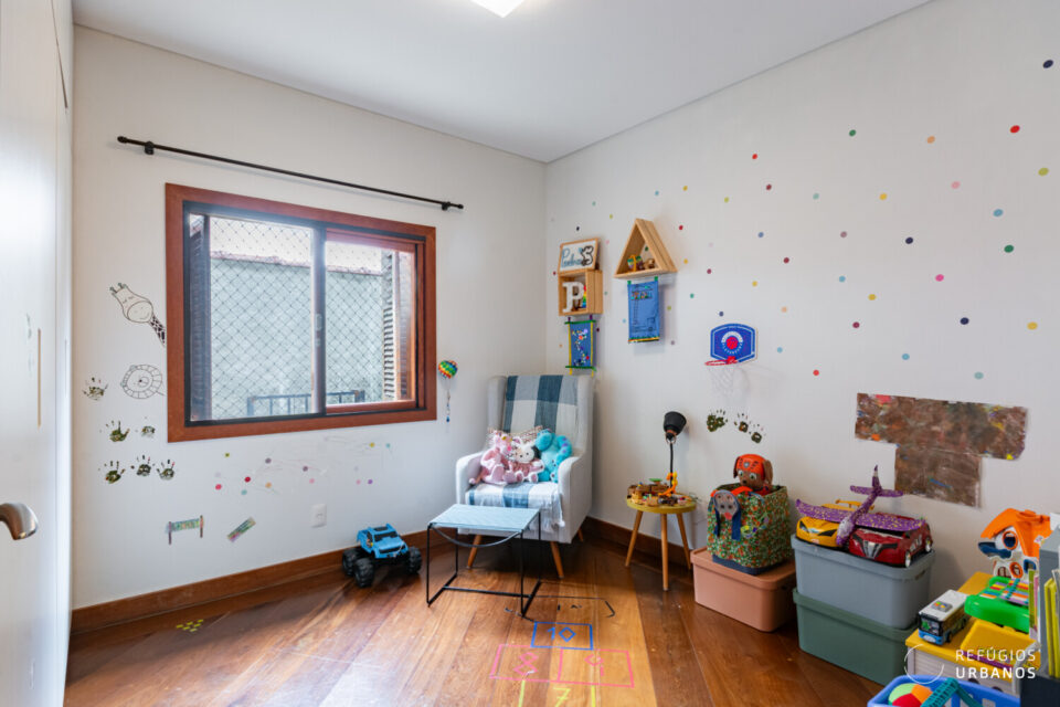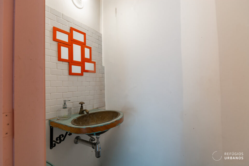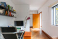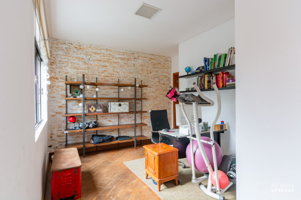 Ao cruzar a porta, uma sala menor te recebe. Hoje ela serve de escritório, mas o espaço é completamente versátil. Assim, dependendo da sua rotina, ela vira sala de estar, cantinho de leitura ou home office.